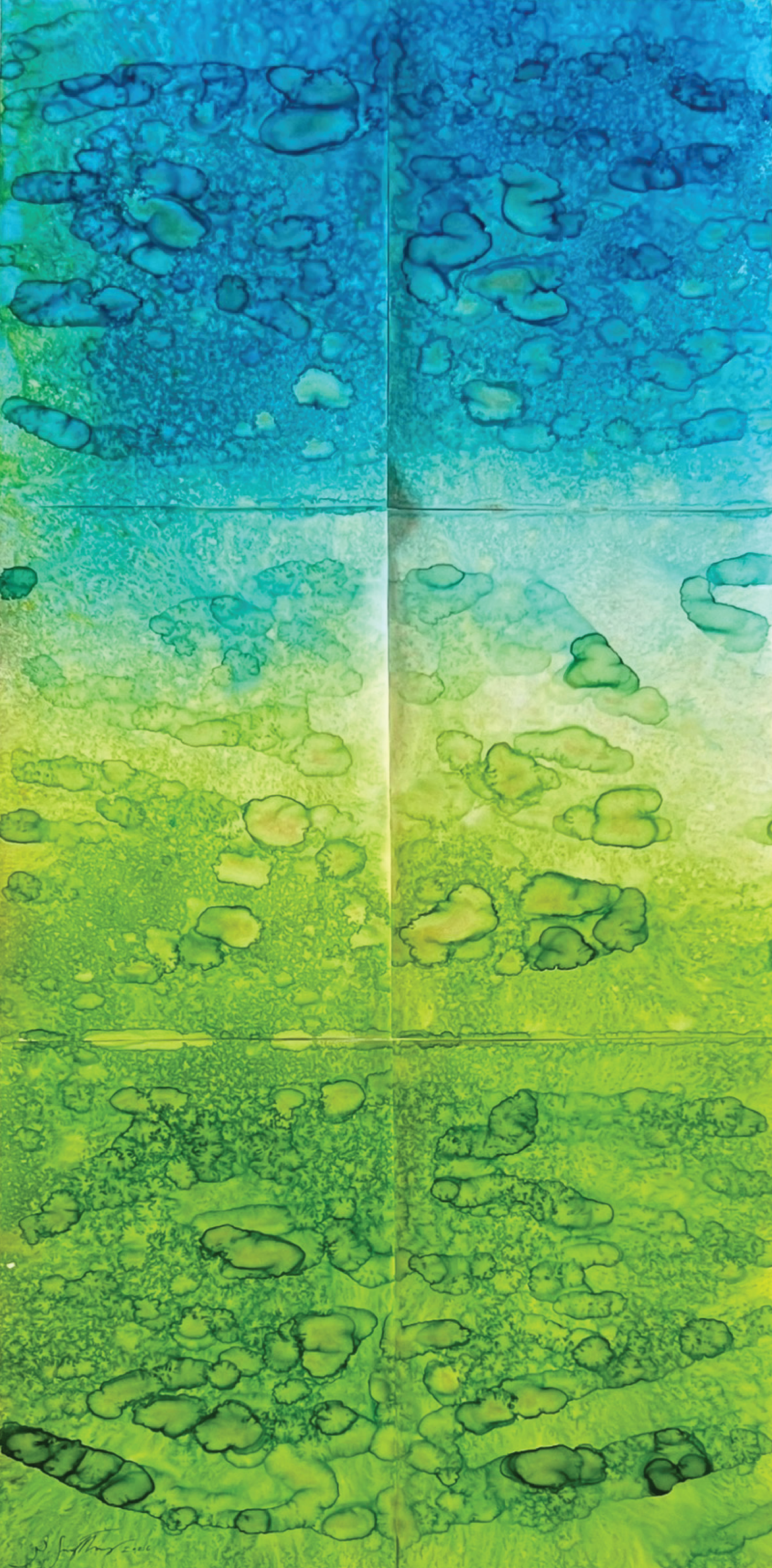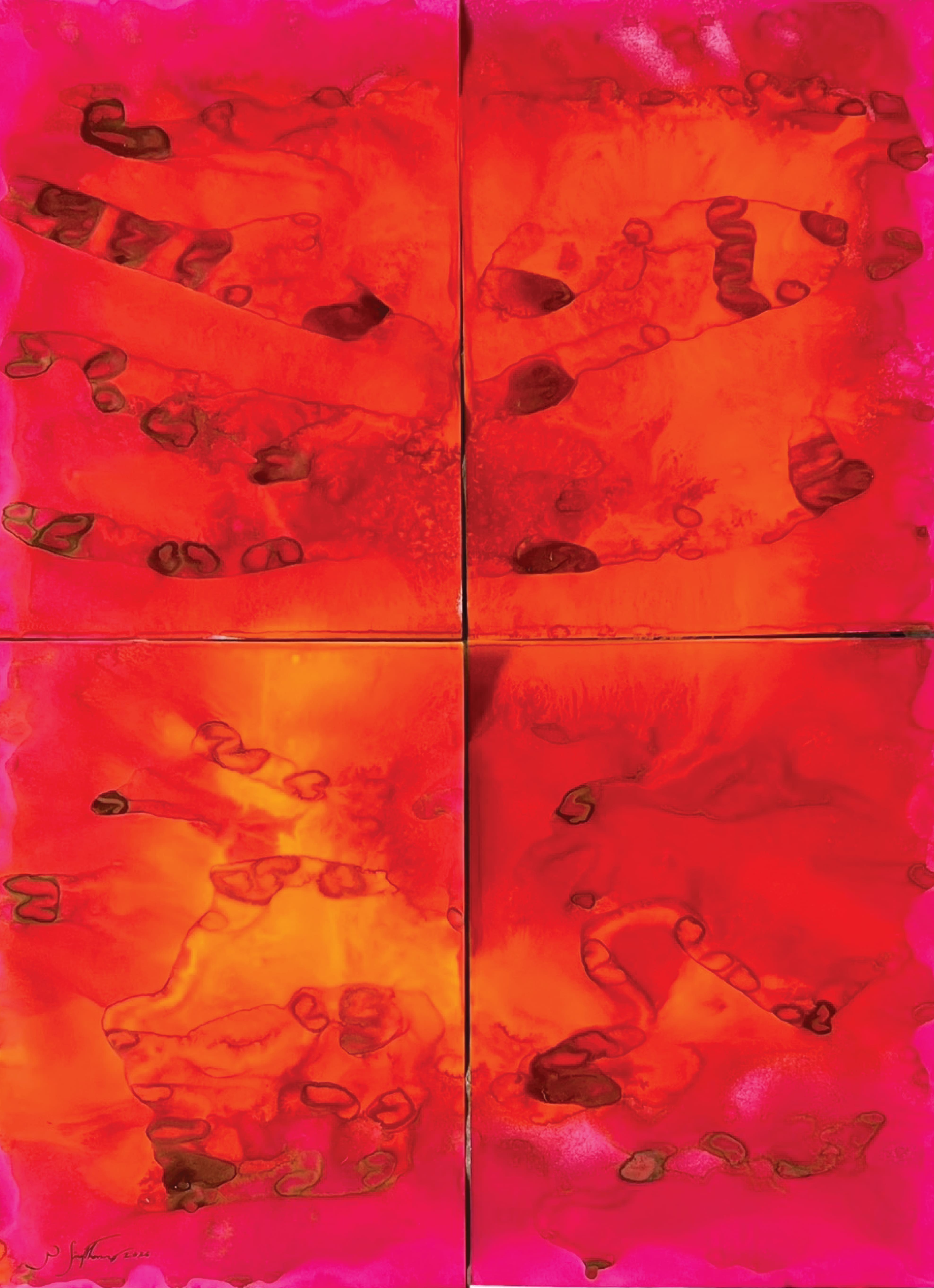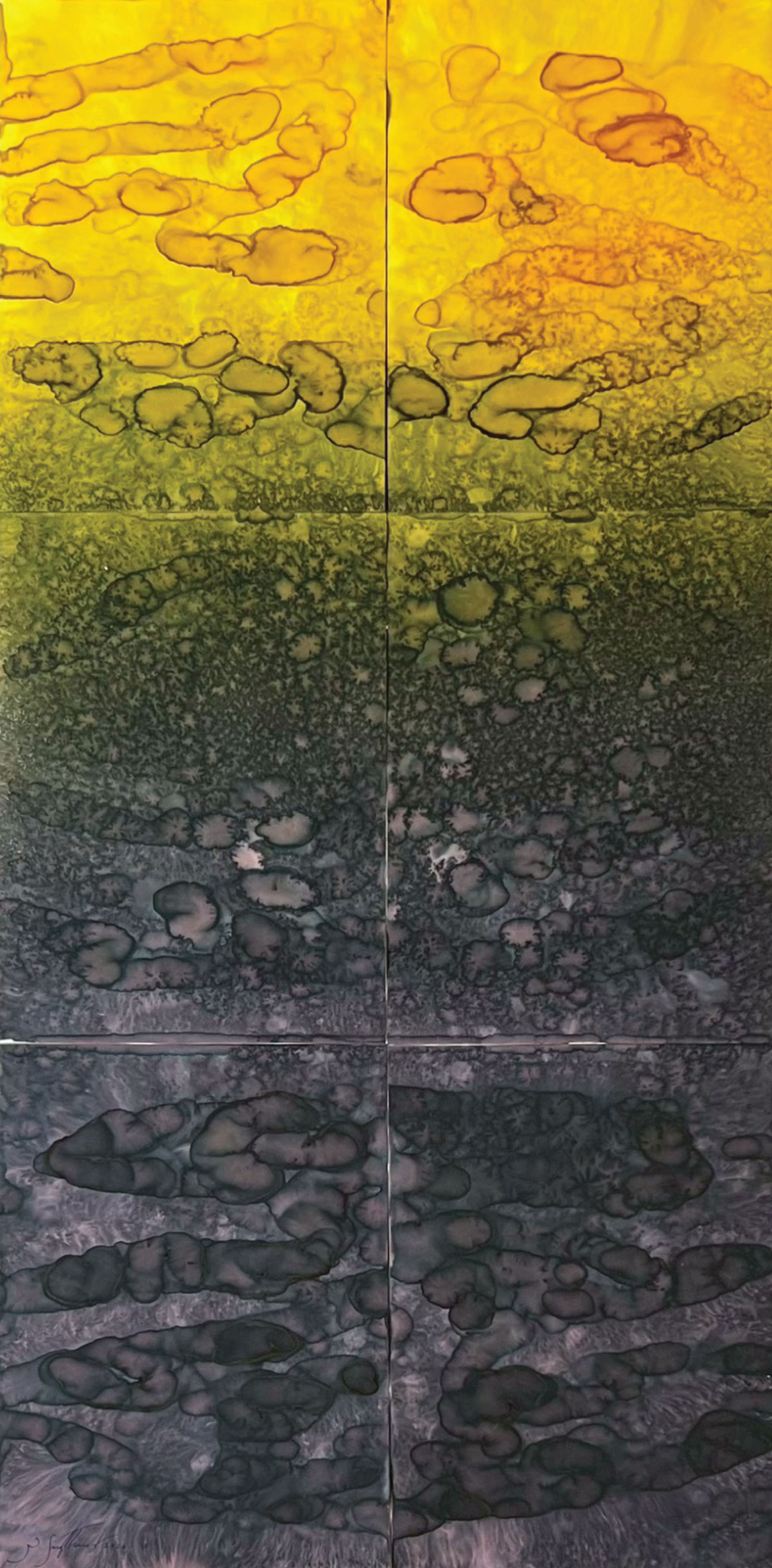 Within this process, control is not imposed but displaced. The artist constructs a field in which conditions interact, allowing forms to arise without predetermined outcomes. What appears is not representation, but manifestation: trac-es of movement, accumulation, dispersion, and transformation unfolding over time. Each work originates from smaller units—an individual surface, a singular flow, a localized event—later assembled into larger compositions. This struc-ture mirrors natural phenomena, where complex systems arise from the convergence of minute elements: droplets