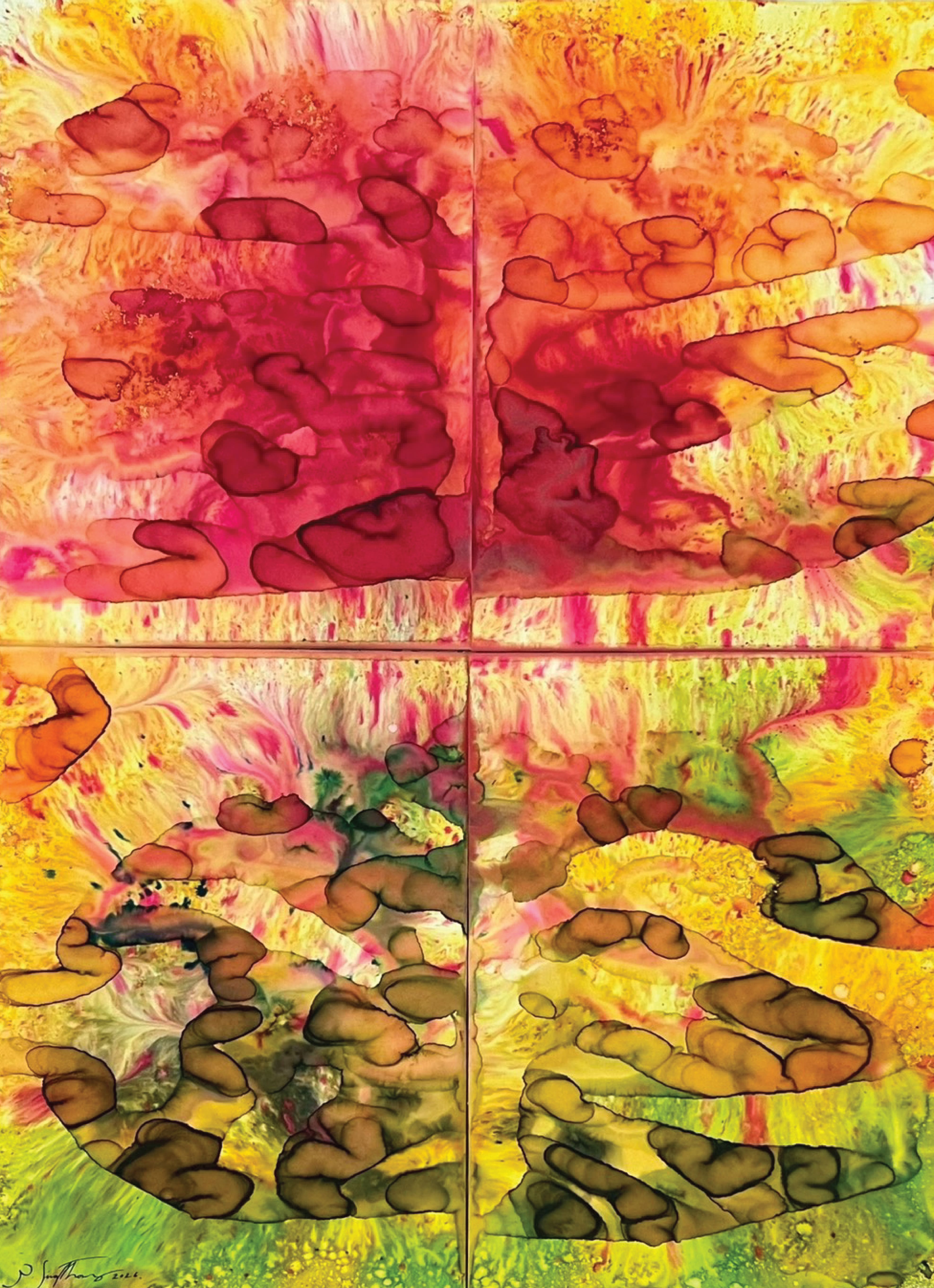 Phattharakorn Singthong creates works from his interest in what cannot be fully controlled. Liquid, pigment, and environment are not merely materials, but collaborators. He does not impose a final image; instead, I construct conditions in which these elements can interact. He was drawn to how larger forms emerge from smaller units—how fragments accumulate into complex structures. Each work is composed of multiple parts, echoing natural systems in which no clear boundary exists between the individual and the whole. For him, beauty does not reside in perfection, but in the truth of process. The work becomes a way of engaging with uncertainty, and of creating space for what is yet to emerge.