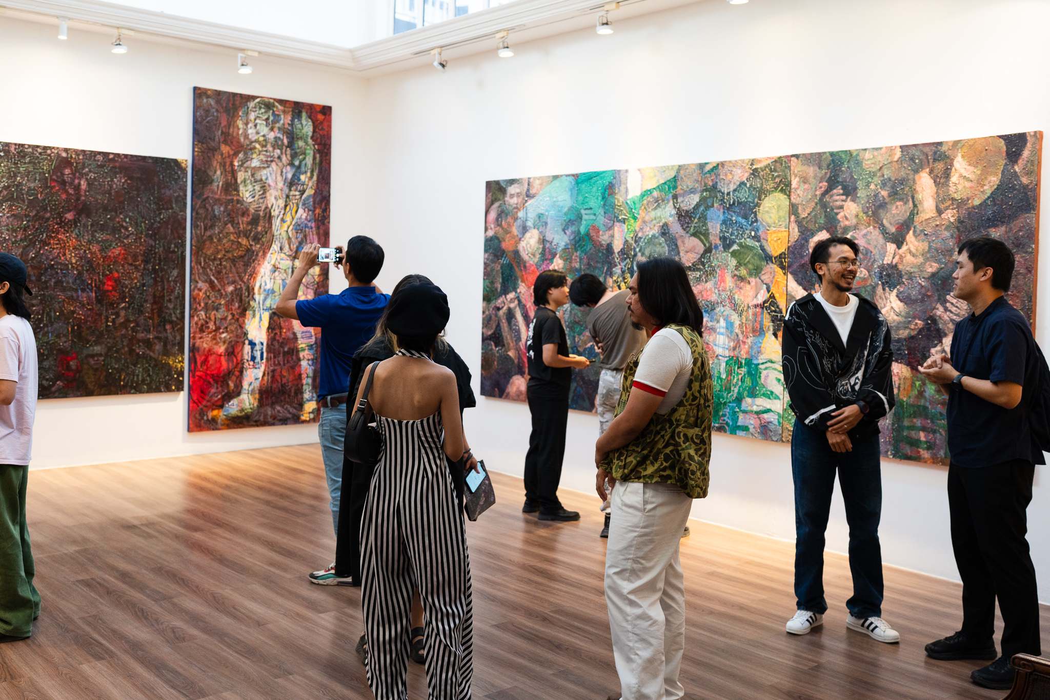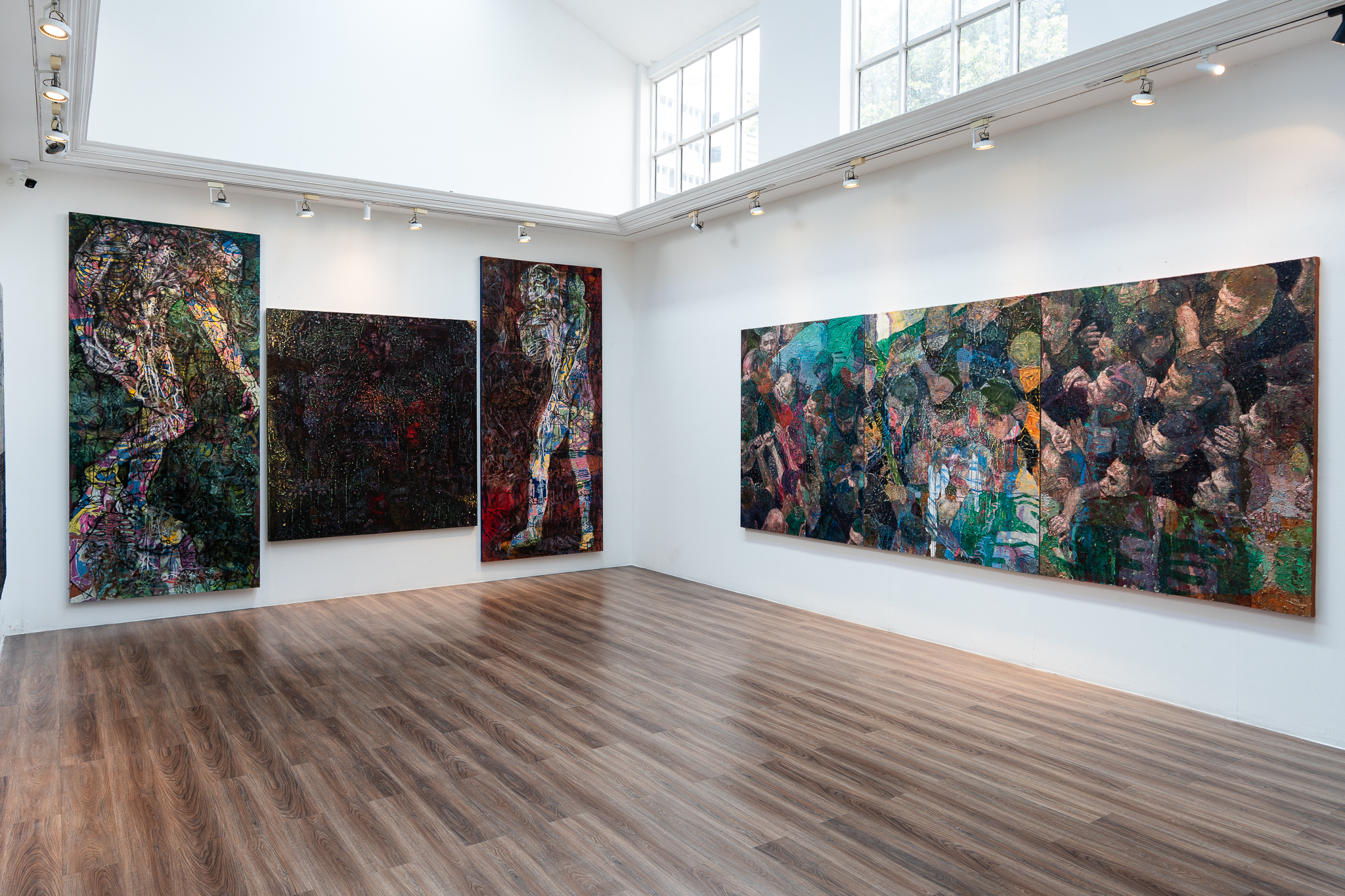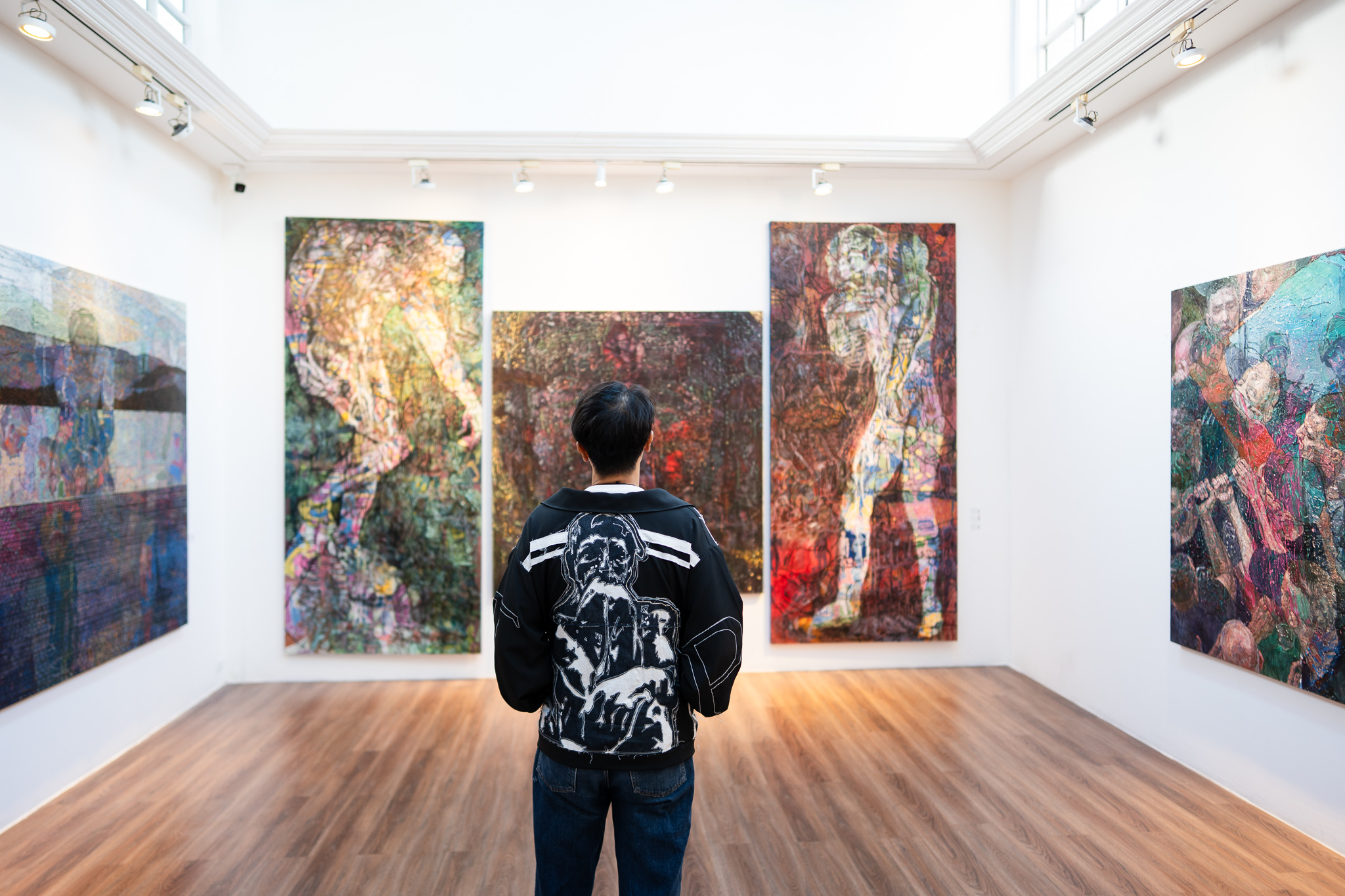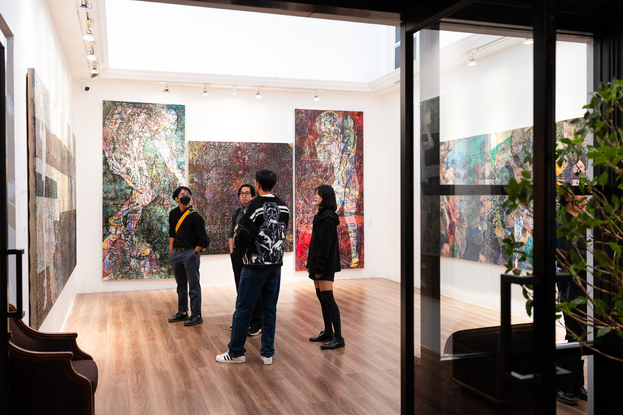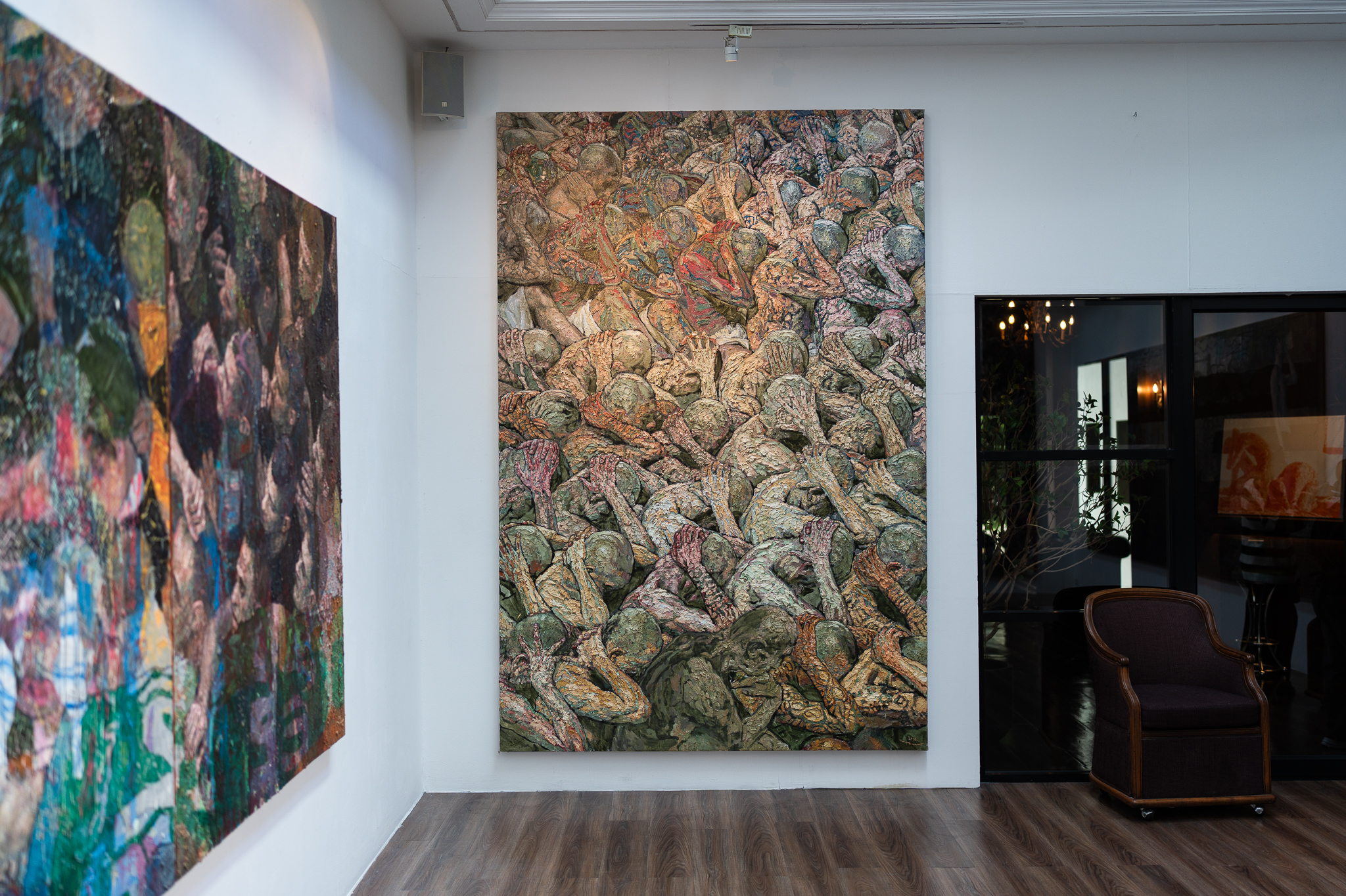 The solo exhibition "Chaos Poet Knight" by Arnont Lertpullpol, presents the hypothesis that chaos in society is a "state" caused by system imperfections, rather than a "designed structure" intended to maintain controllers' power. Arnont reinterprets symbols from Auguste Rodin's paintings The Gates of Hell and The Poet, which depict contemplation of sin and judgment in the afterlife, in the context of today, where "the gates of hell" represent a violent, war-torn, and corrupted human world. The Poet is not just a seeker of wisdom in this case, but also a "manipulator" who observes the misery of others with cold eyes. By conveying the perspective of "those affected" through a creative process that reveals the imperfections of both painting and morality, drawing from contemporary photographs and videos, and employing techniques such as scratching, sanding, thick impasto painting, and layering images, the works create surfaces that reflect the weight and density of social structures. Partially deleting and blurring images calls into doubt the truth, which is picked and altered by power. By revealing some layers of paint while concealing others, each piece contains a trace of concealment and revelation that coexists continuously. The pieces also incorporate pictures that imagine and forecast the grave implications of such buildings persisting.