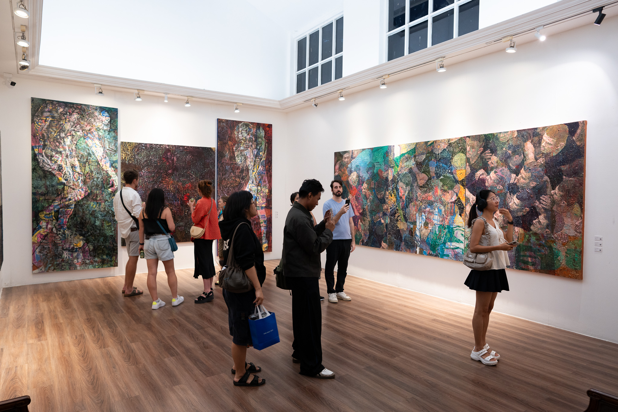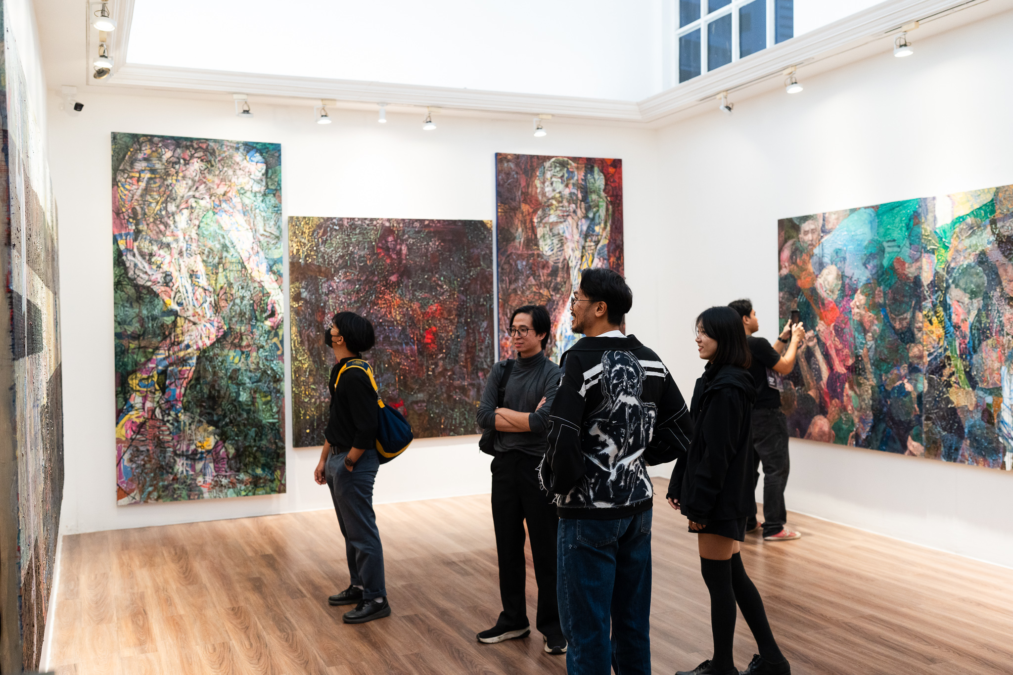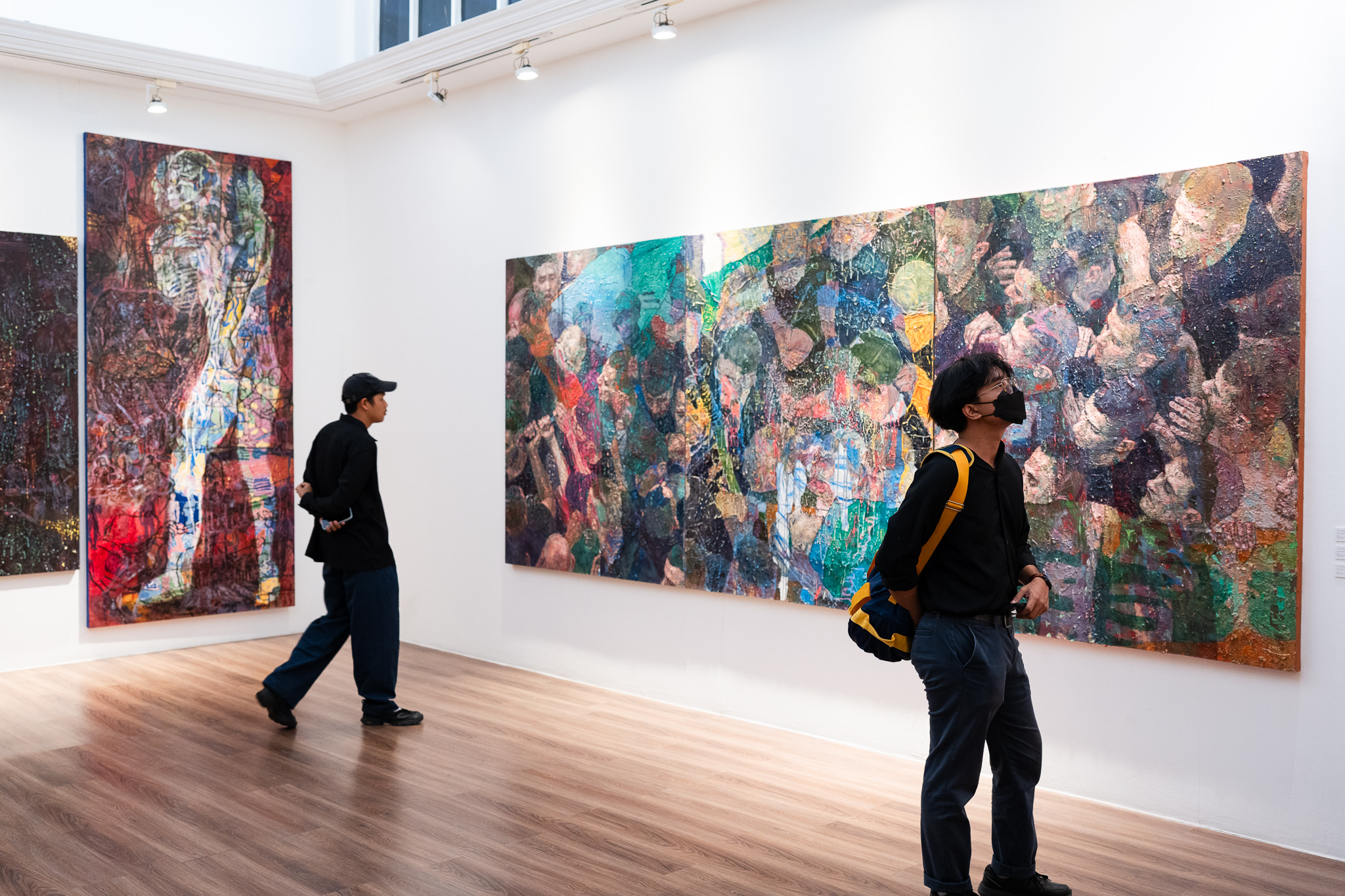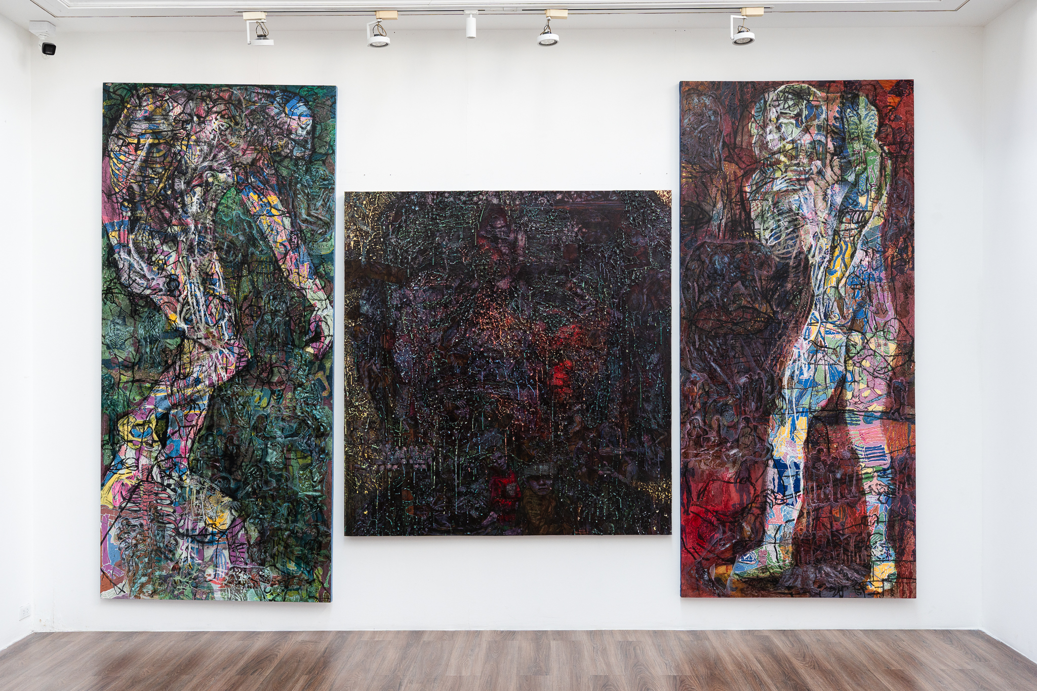 The solo exhibition "Chaos Poet Knight" by Arnont Lertpullpol, presents the hypothesis that chaos in society is a "state" caused by system imperfections, rather than a "designed structure" intended to maintain controllers' power. Arnont reinterprets symbols from Auguste Rodin's paintings The Gates of Hell and The Poet, which depict contemplation of sin and judgment in the afterlife, in the context of today, where "the gates of hell" represent a violent, war-torn, and corrupted human world. The Poet is not just a seeker of wisdom in this case, but also a "manipulator" who observes the misery of others with cold eyes. By conveying the perspective of "those affected" through a creative process that reveals the imperfections of both painting and morality, drawing from contemporary photographs and videos, and employing techniques such as scratching, sanding, thick impasto painting, and layering images, the works create surfaces that reflect the weight and density of social structures. Partially deleting and blurring images calls into doubt the truth, which is picked and altered by power. By revealing some layers of paint while concealing others, each piece contains a trace of concealment and revelation that coexists continuously. The pieces also incorporate pictures that imagine and forecast the grave implications of such buildings persisting.