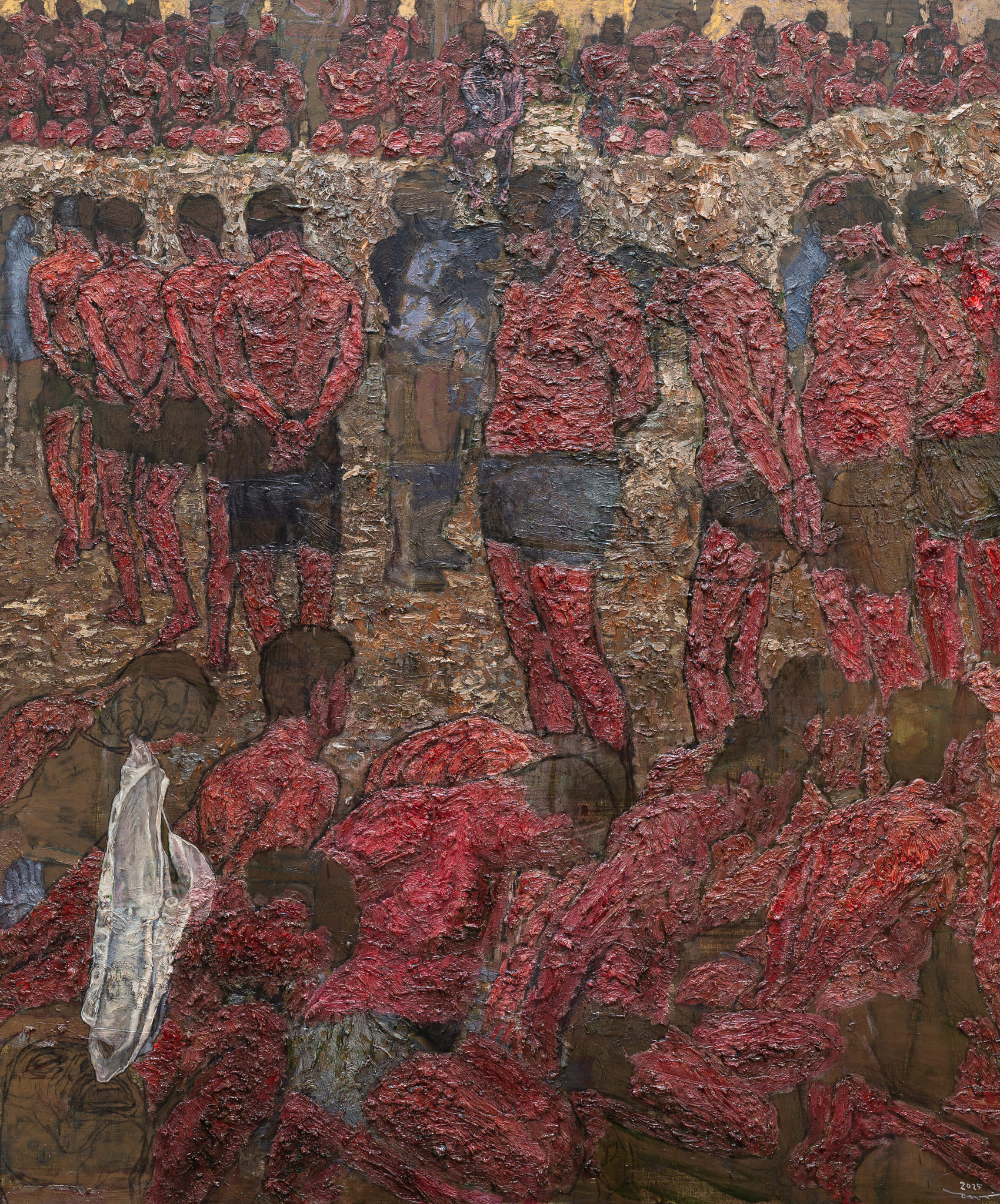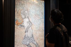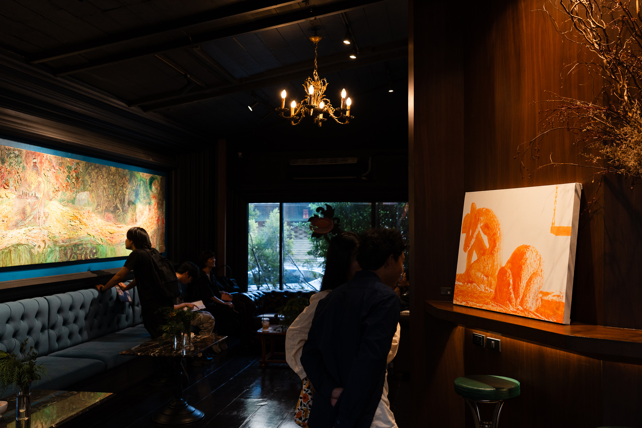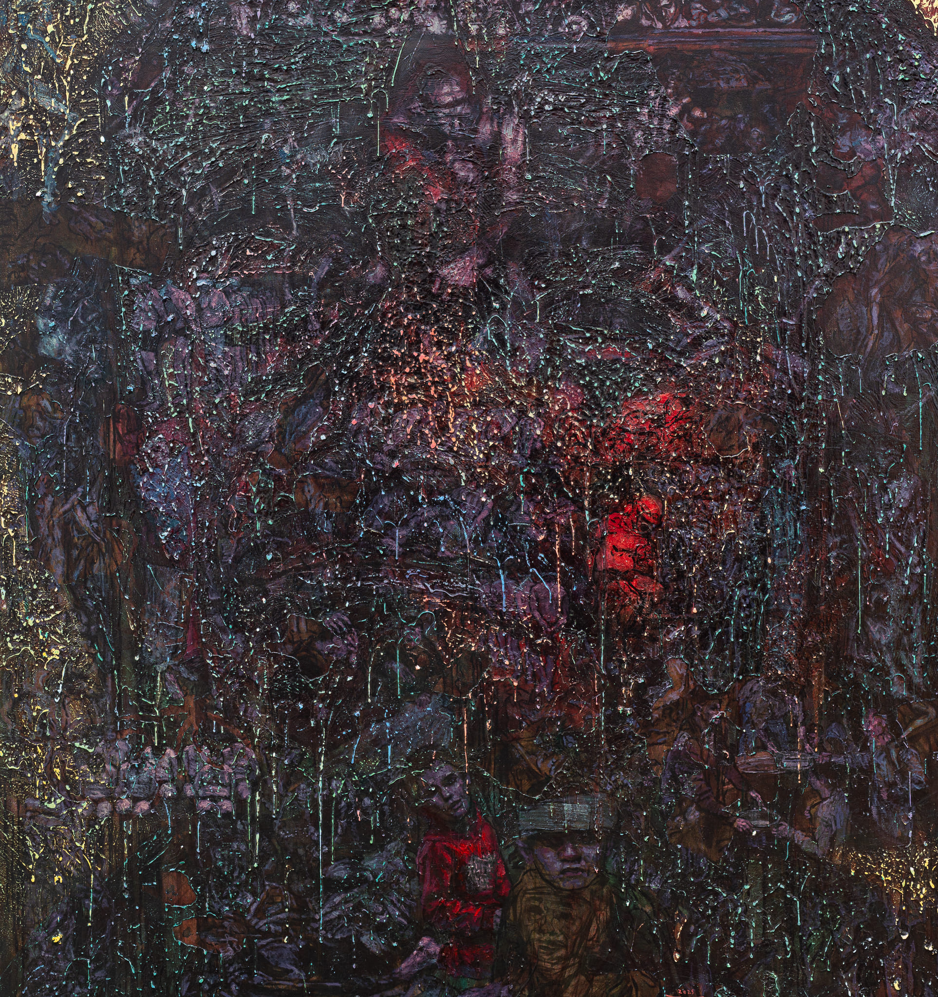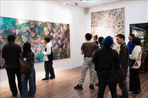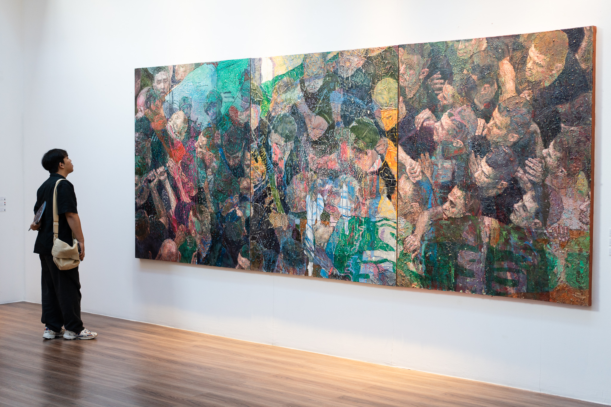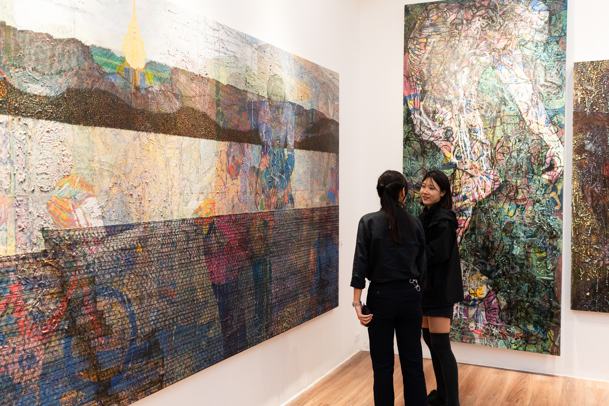 The solo exhibition "Chaos Poet Knight" by Arnont Lertpullpol, presents the hypothesis that chaos in society is a "state" caused by system imperfections, rather than a "designed structure" intended to maintain controllers' power. Arnont reinterprets symbols from Auguste Rodin's paintings The Gates of Hell and The Poet, which depict contemplation of sin and judgment in the afterlife, in the context of today, where "the gates of hell" represent a violent, war-torn, and corrupted human world. The Poet is not just a seeker of wisdom in this case, but also a "manipulator" who observes the misery of others with cold eyes. By conveying the perspective of "those affected" through a creative process that reveals the imperfections of both painting and morality, drawing from contemporary photographs and videos, and employing techniques such as scratching, sanding, thick impasto painting, and layering images, the works create surfaces that reflect the weight and density of social structures. Partially deleting and blurring images calls into doubt the truth, which is picked and altered by power. By revealing some layers of paint while concealing others, each piece contains a trace of concealment and revelation that coexists continuously. The pieces also incorporate pictures that imagine and forecast the grave implications of such buildings persisting.