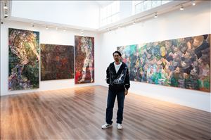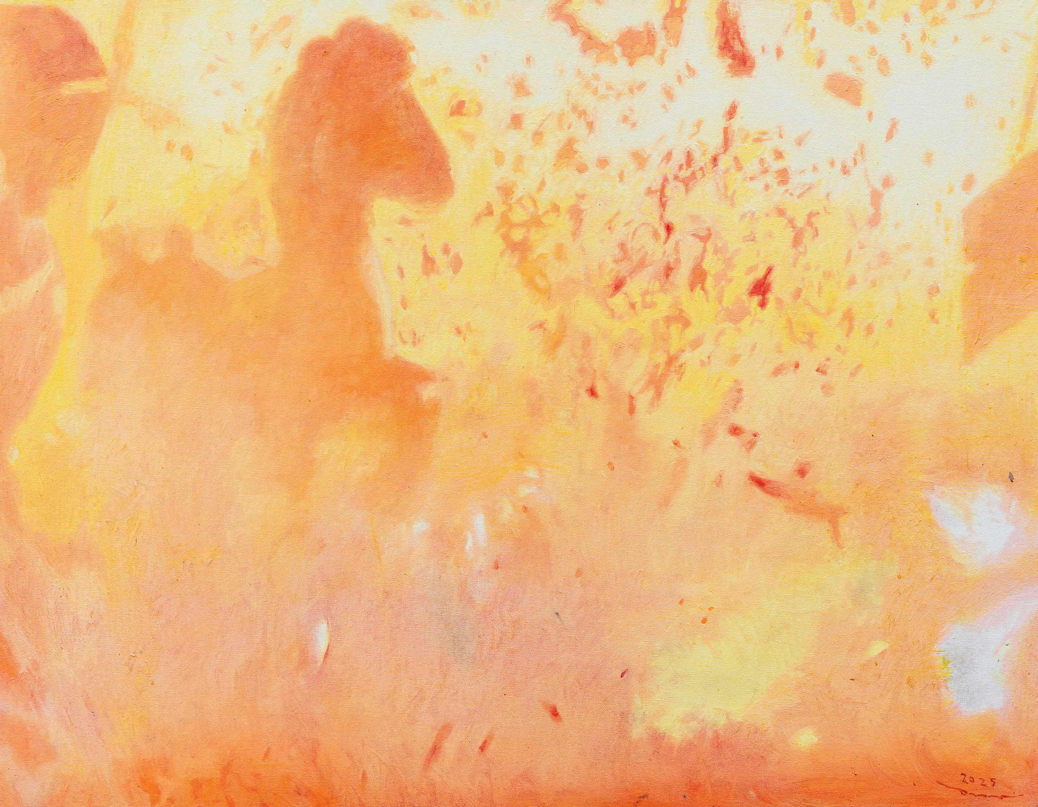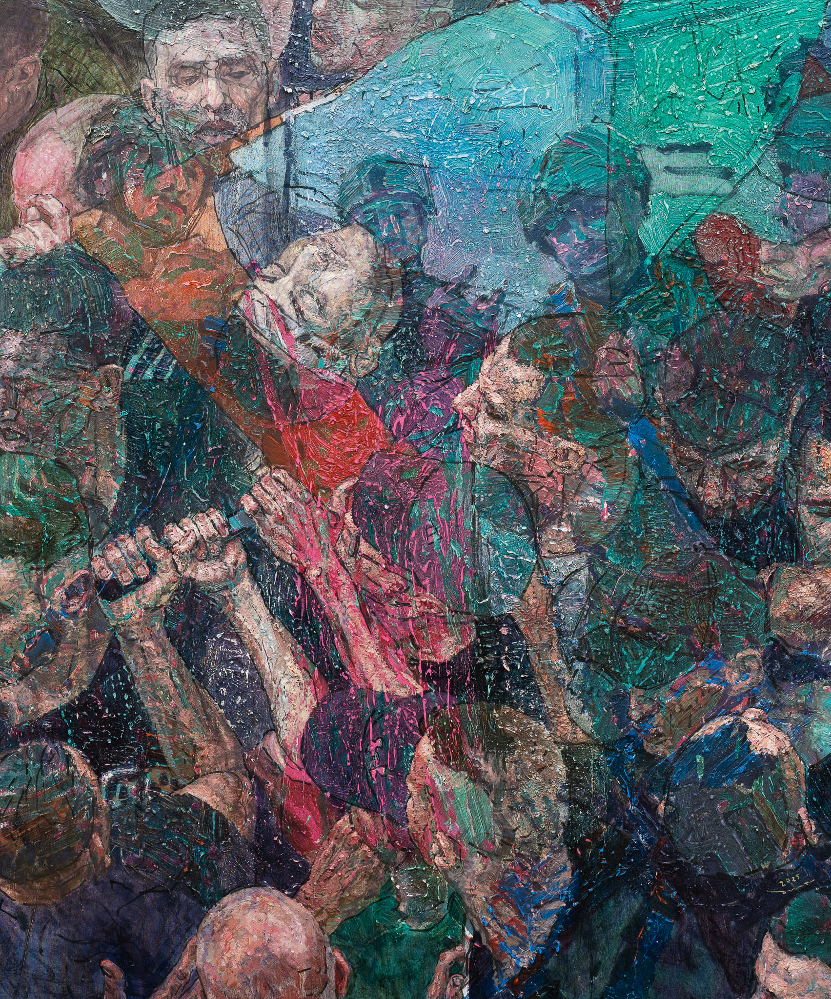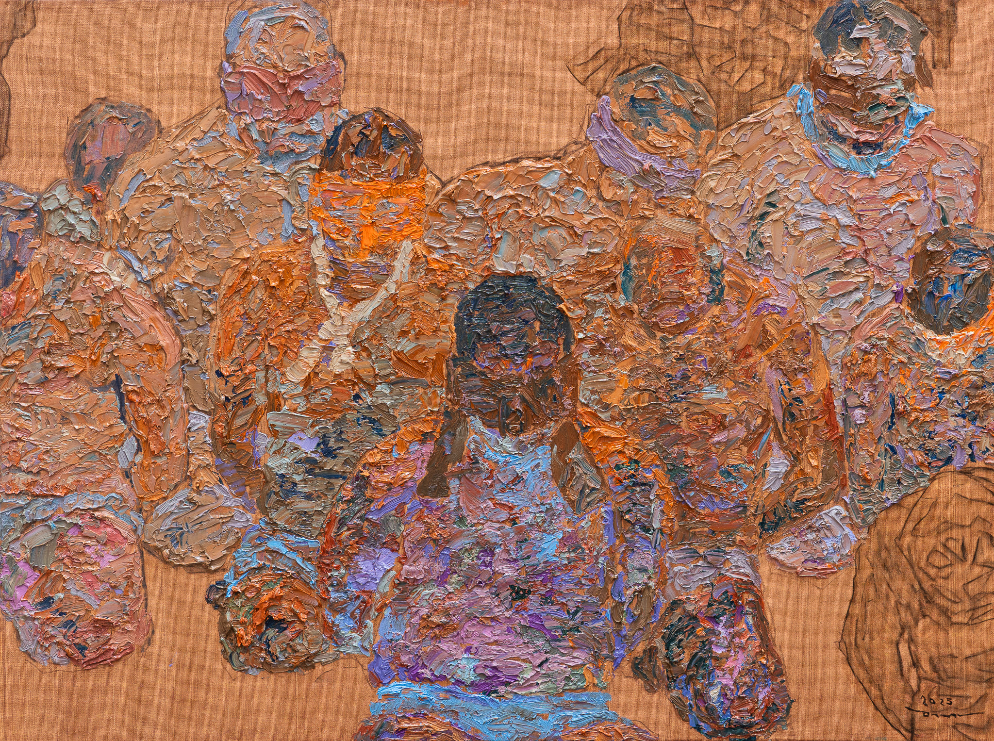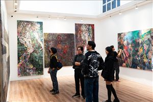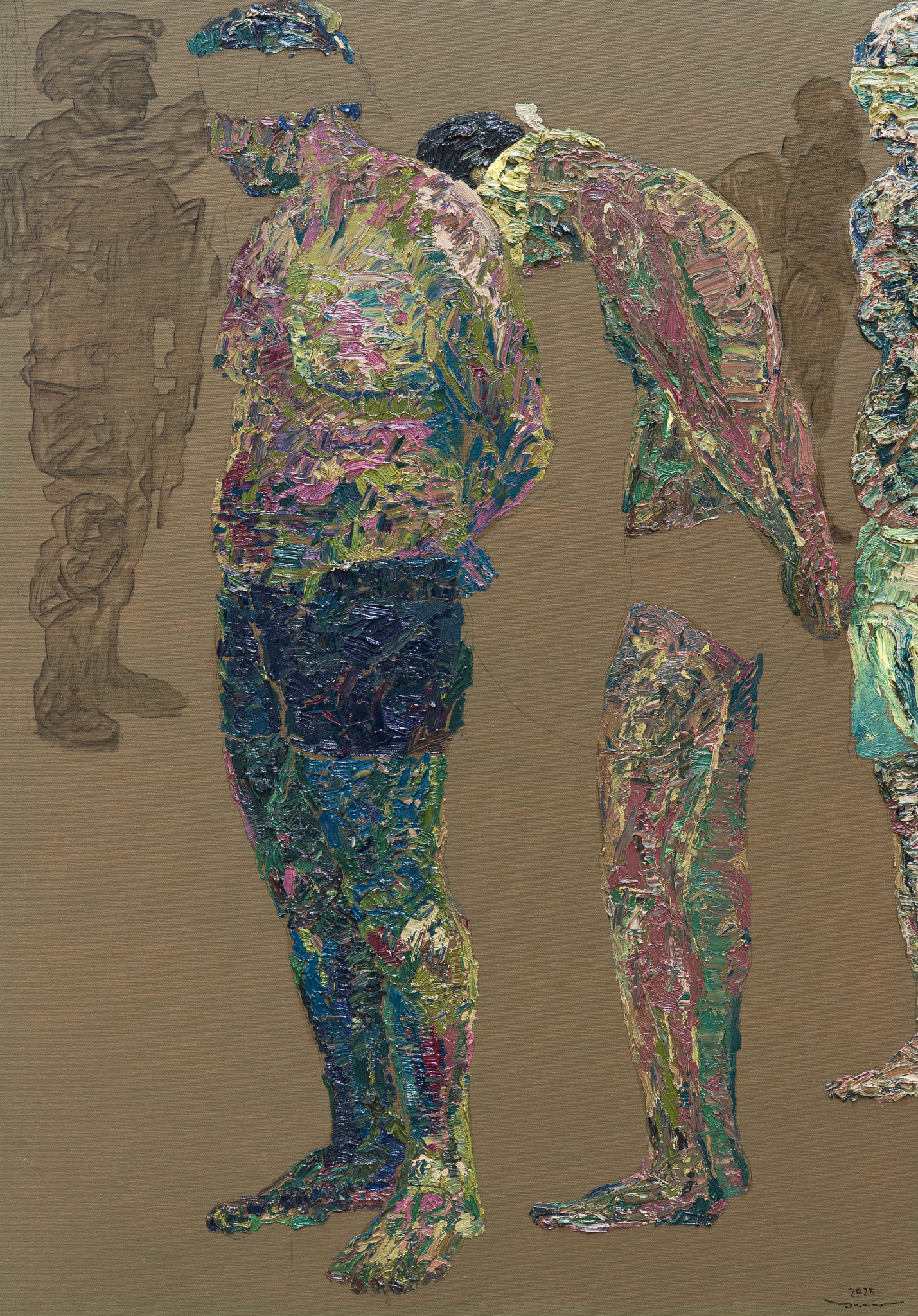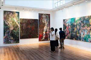 The solo exhibition "Chaos Poet Knight" by Arnont Lertpullpol, presents the hypothesis that chaos in society is a "state" caused by system imperfections, rather than a "designed structure" intended to maintain controllers' power. Arnont reinterprets symbols from Auguste Rodin's paintings The Gates of Hell and The Poet, which depict contemplation of sin and judgment in the afterlife, in the context of today, where "the gates of hell" represent a violent, war-torn, and corrupted human world. The Poet is not just a seeker of wisdom in this case, but also a "manipulator" who observes the misery of others with cold eyes. By conveying the perspective of "those affected" through a creative process that reveals the imperfections of both painting and morality, drawing from contemporary photographs and videos, and employing techniques such as scratching, sanding, thick impasto painting, and layering images, the works create surfaces that reflect the weight and density of social structures. Partially deleting and blurring images calls into doubt the truth, which is picked and altered by power. By revealing some layers of paint while concealing others, each piece contains a trace of concealment and revelation that coexists continuously. The pieces also incorporate pictures that imagine and forecast the grave implications of such buildings persisting.