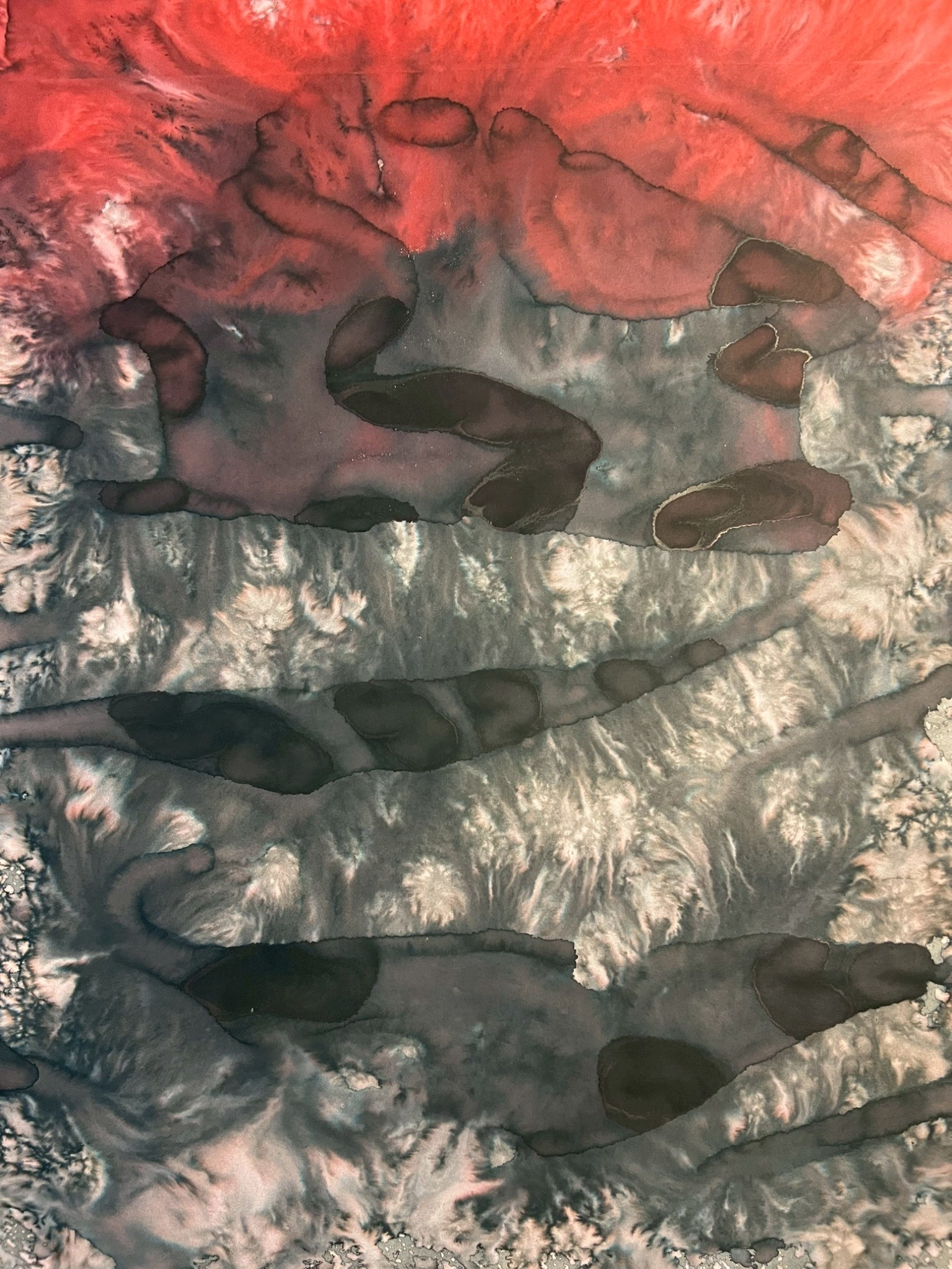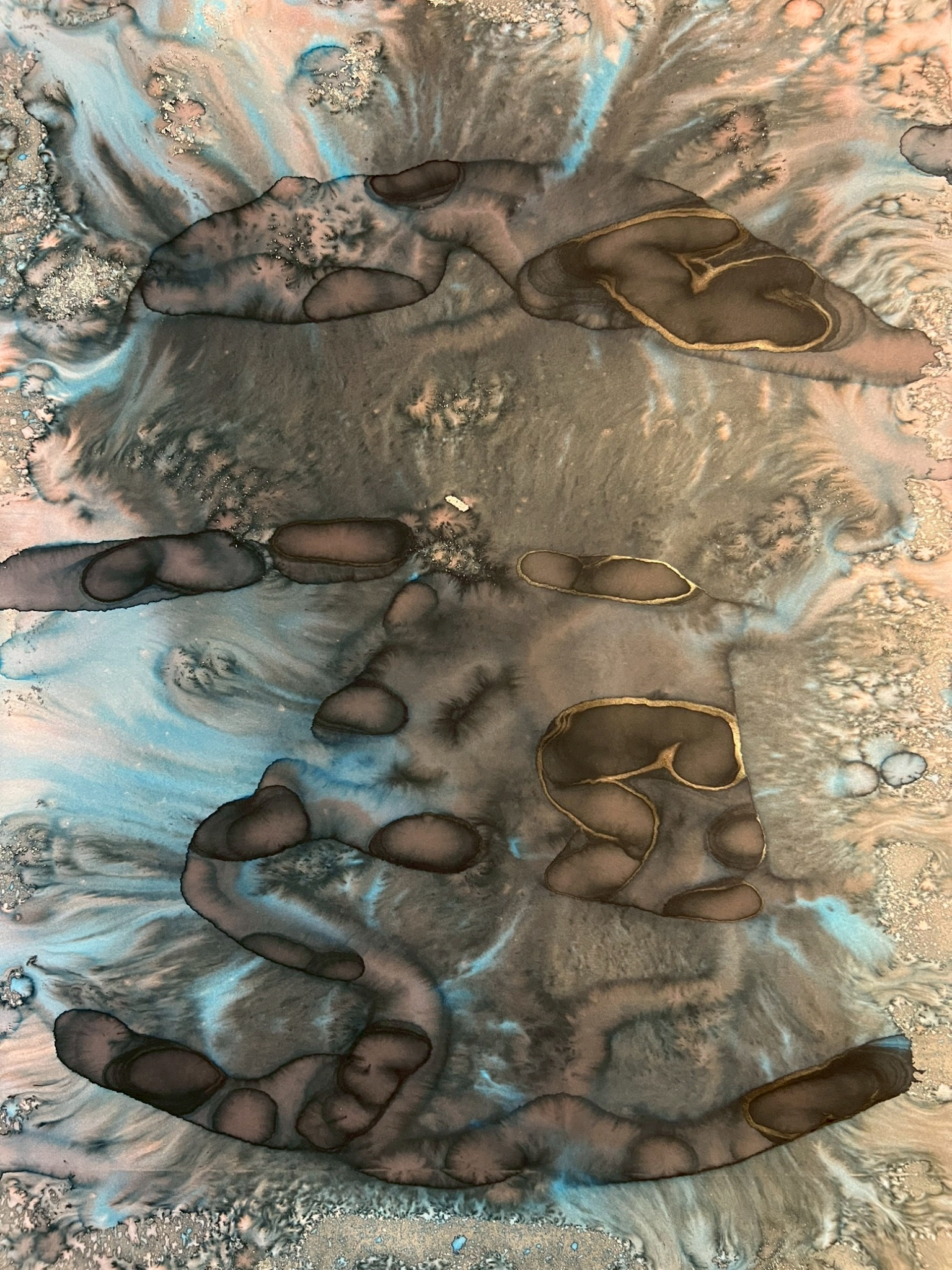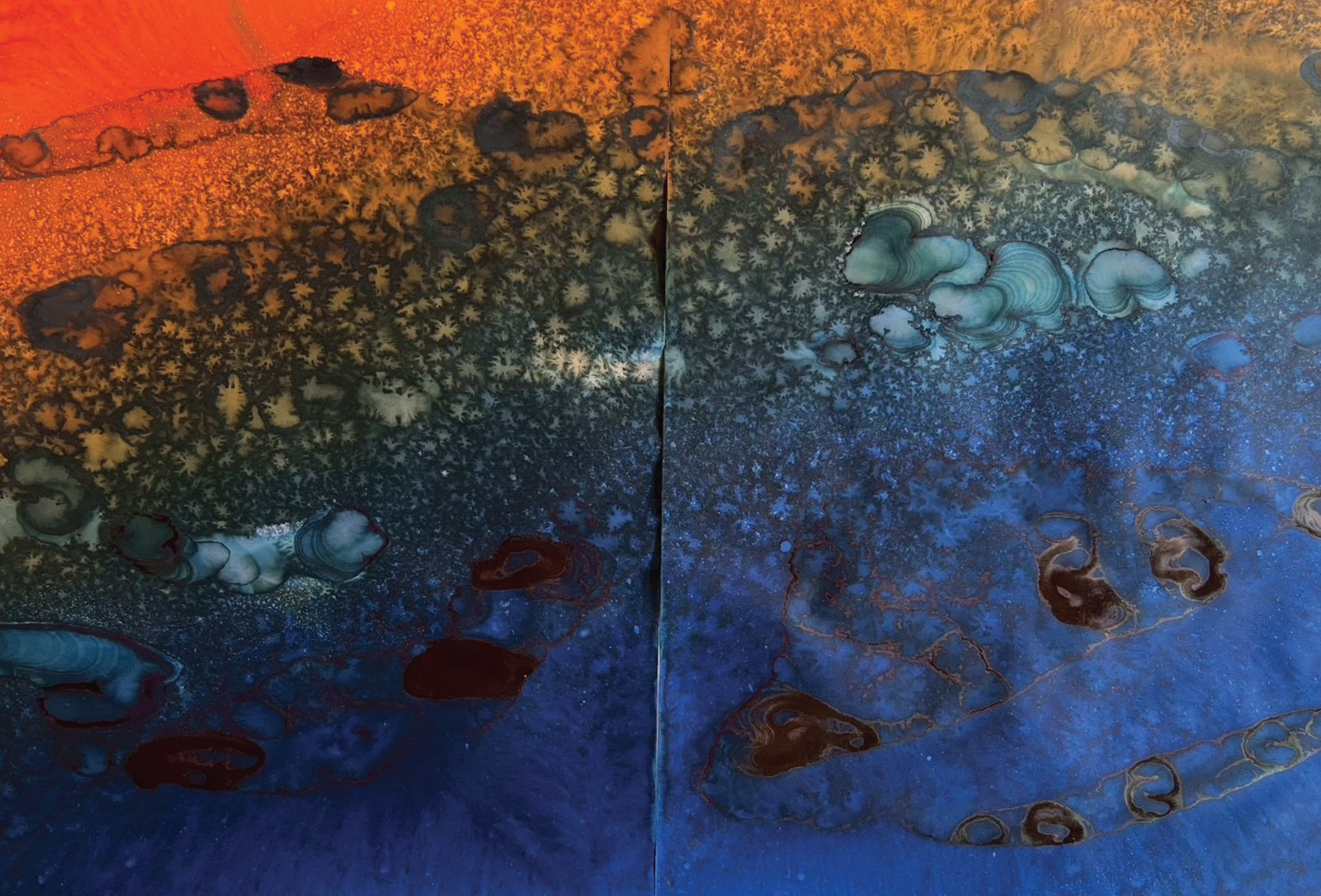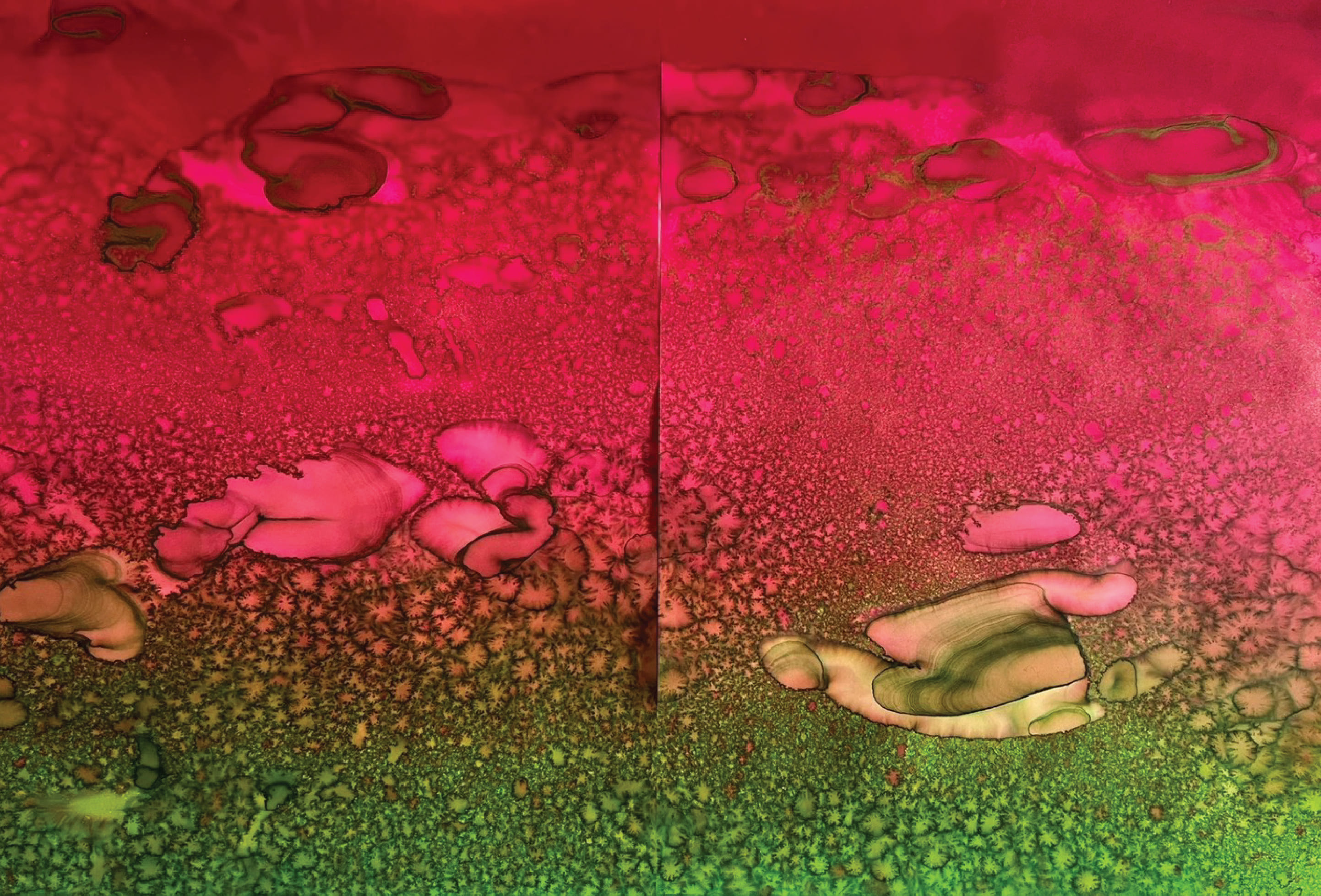 Fields of Conditions investigates the formation of reality through the interplay of forces—liquid, pigment, temperature, flow, and surface—none of which acts as a singular determinant, but rather as conditions that enable form to emerge.
