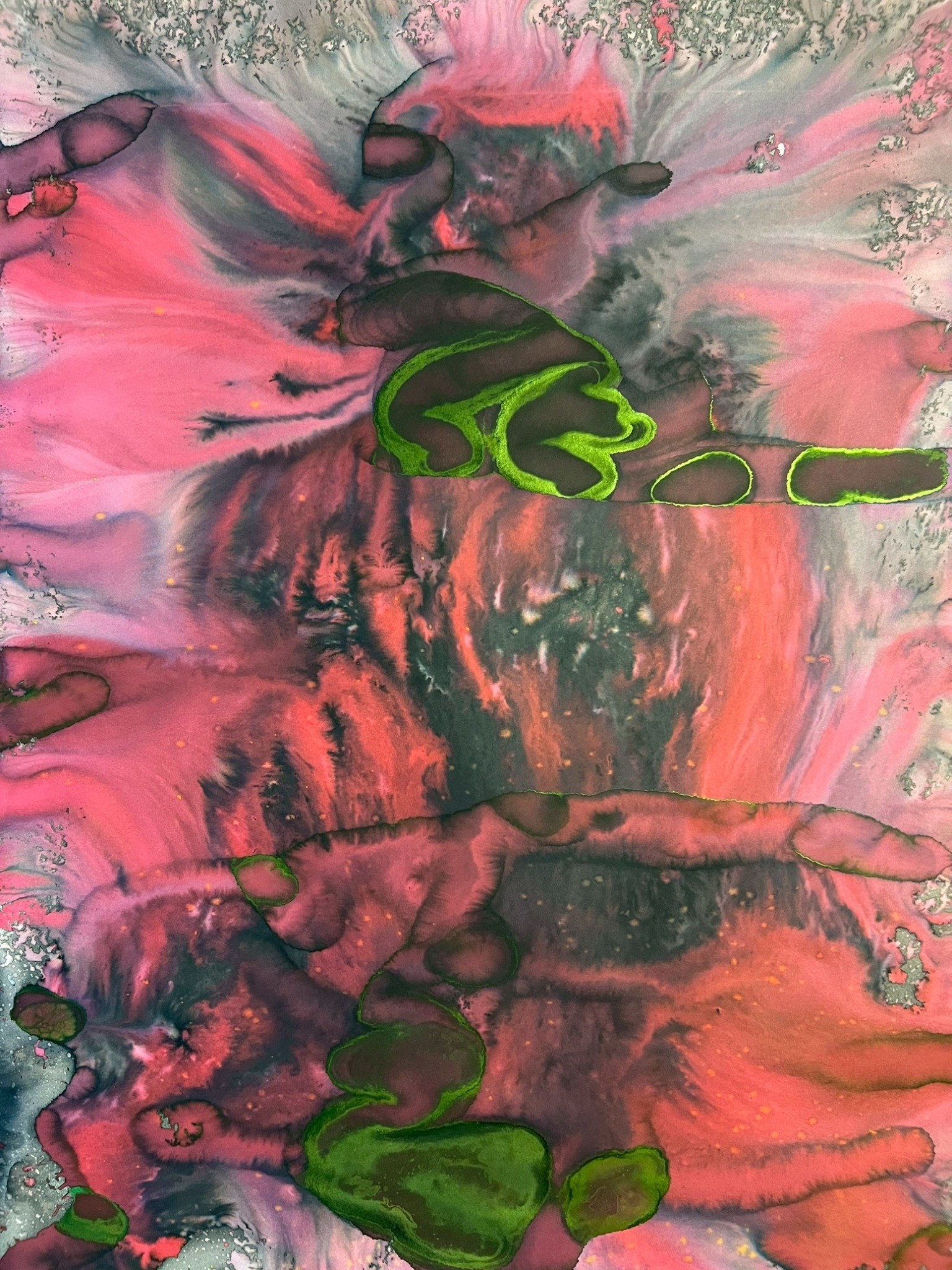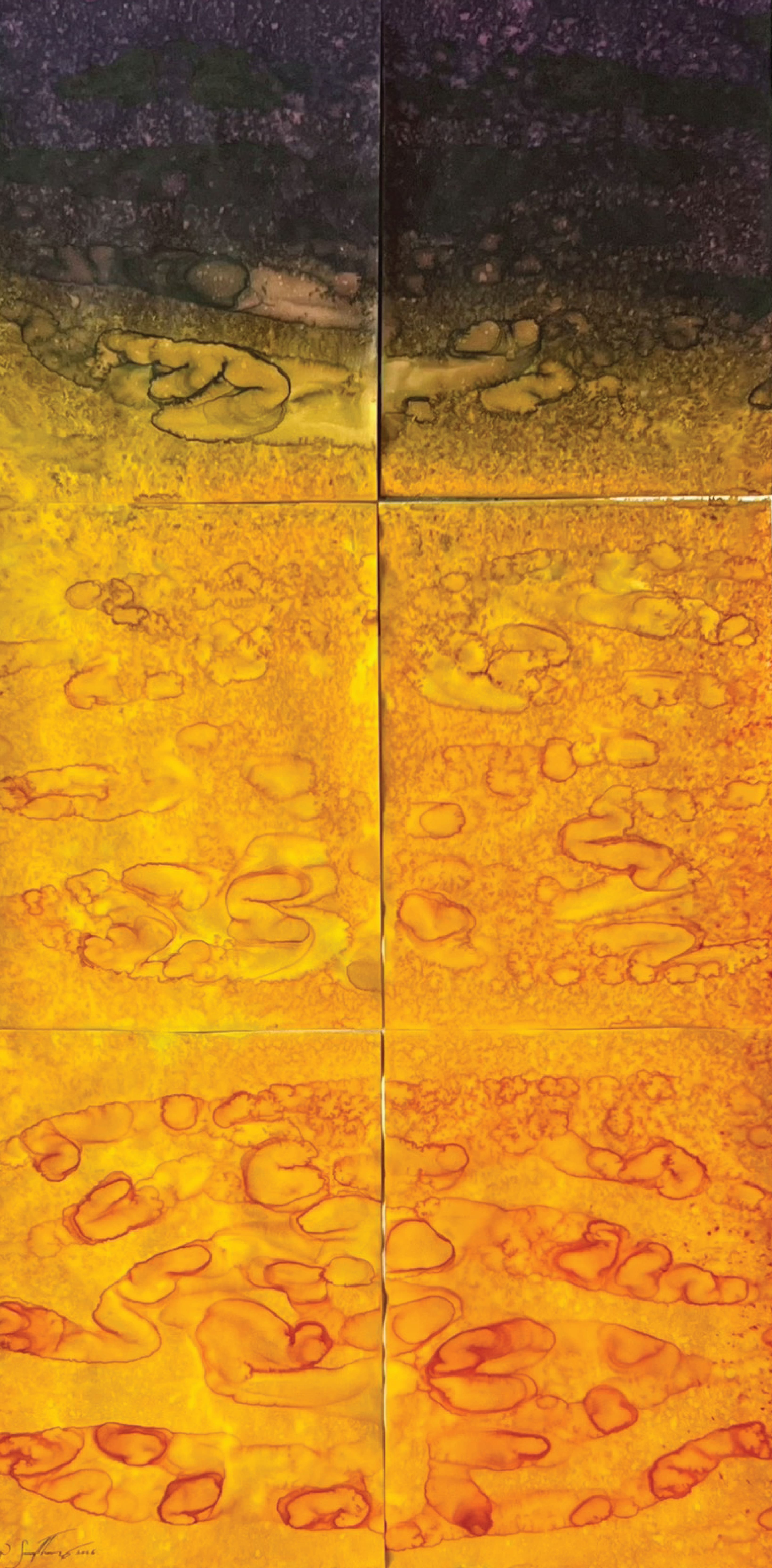 Within this process, control is not imposed but displaced. The artist constructs a field in which conditions interact, allowing forms to arise without predetermined outcomes. What appears is not representation, but manifestation: trac-es of movement, accumulation, dispersion, and transformation unfolding over time. Each work originates from smaller units—an individual surface, a singular flow, a localized event—later assembled into larger compositions. This struc-ture mirrors natural phenomena, where complex systems arise from the convergence of minute elements: droplets