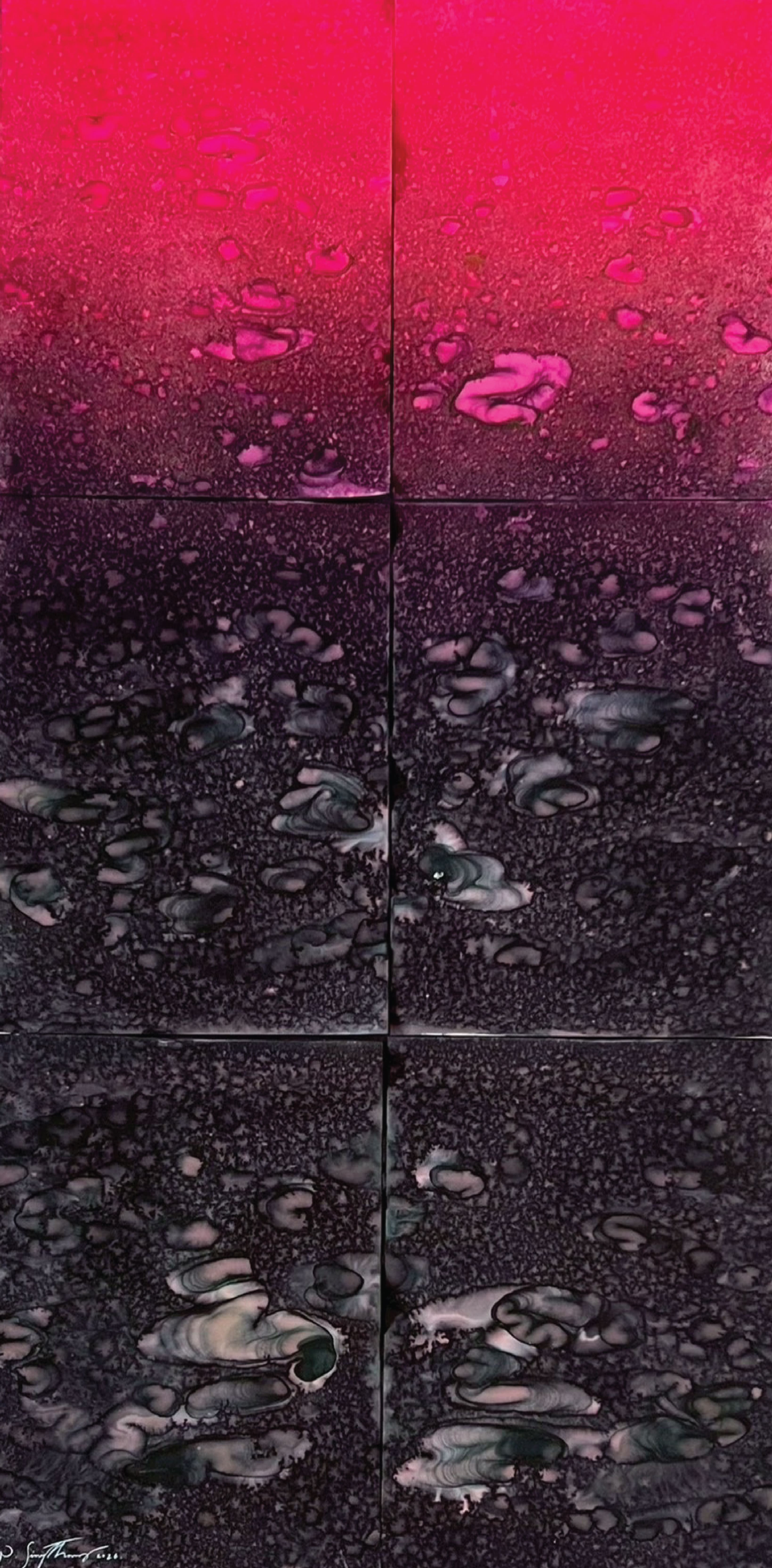 Phattharakorn Singthong creates works from his interest in what cannot be fully controlled. Liquid, pigment, and environment are not merely materials, but collaborators. He does not impose a final image; instead, I construct conditions in which these elements can interact. He was drawn to how larger forms emerge from smaller units—how fragments accumulate into complex structures. Each work is composed of multiple parts, echoing natural systems in which no clear boundary exists between the individual and the whole. For him, beauty does not reside in perfection, but in the truth of process. The work becomes a way of engaging with uncertainty, and of creating space for what is yet to emerge.