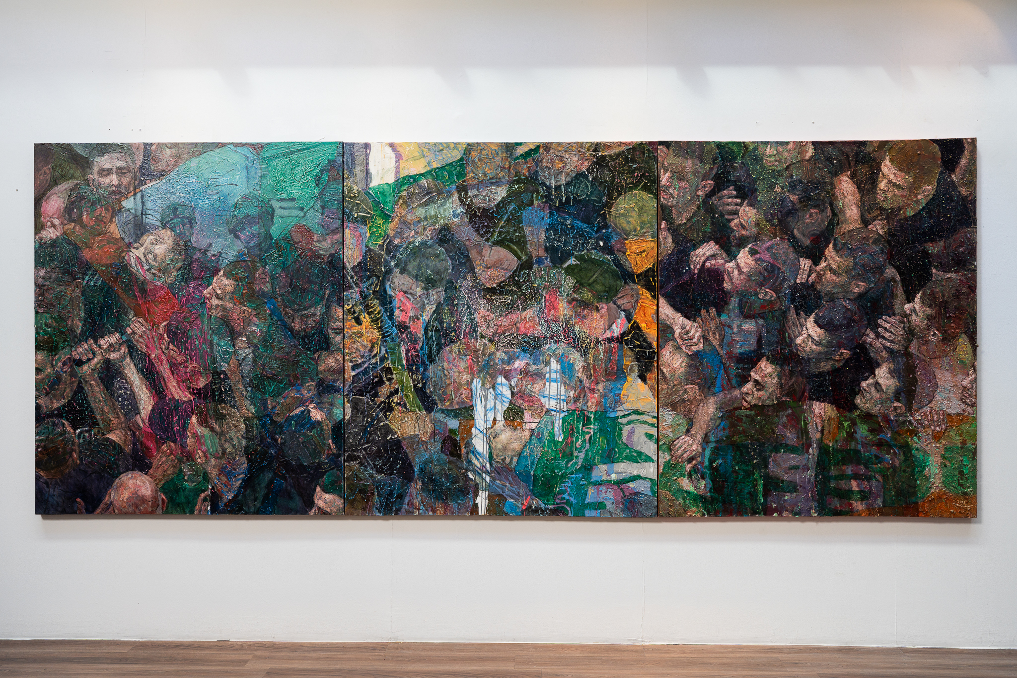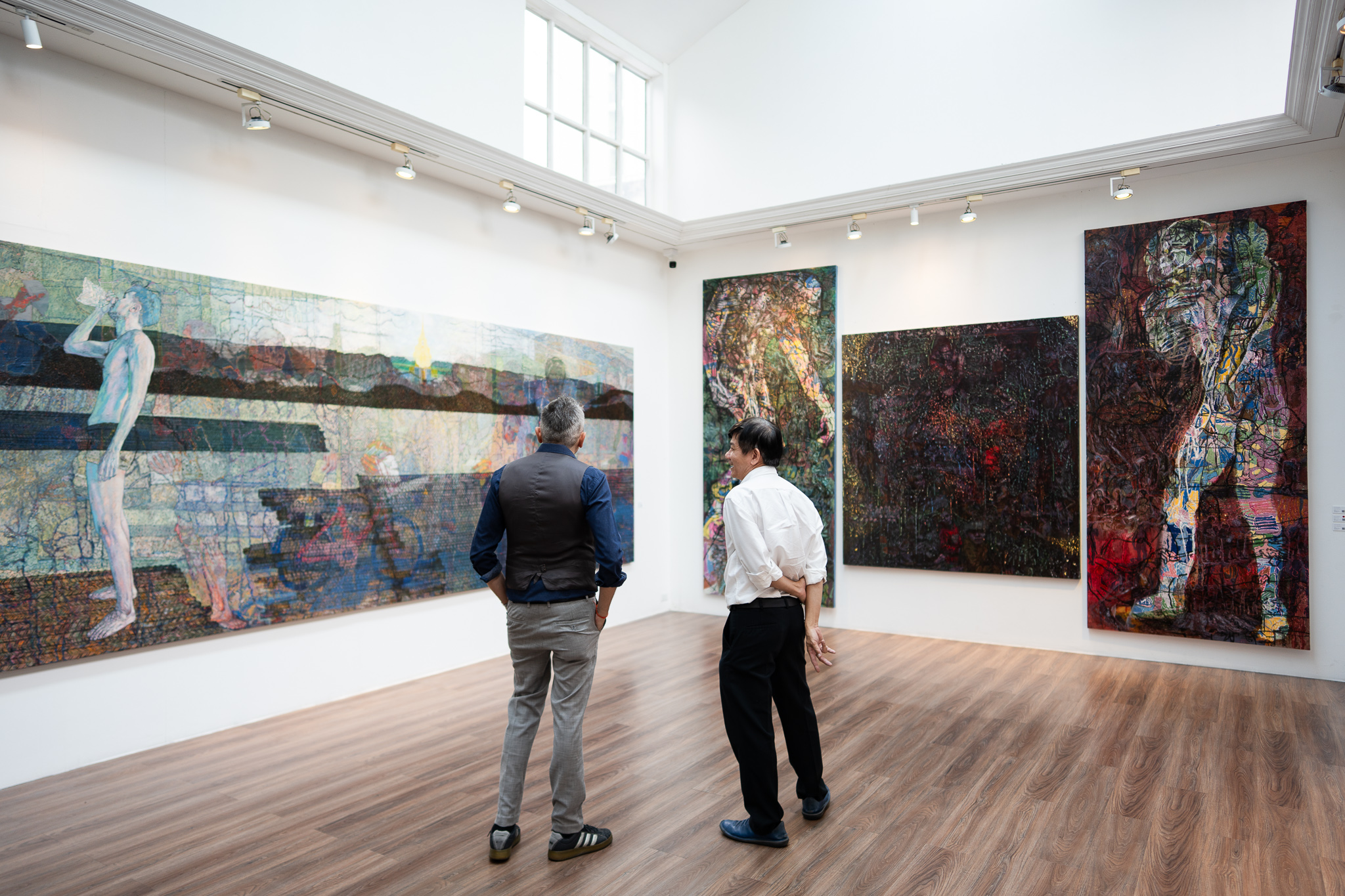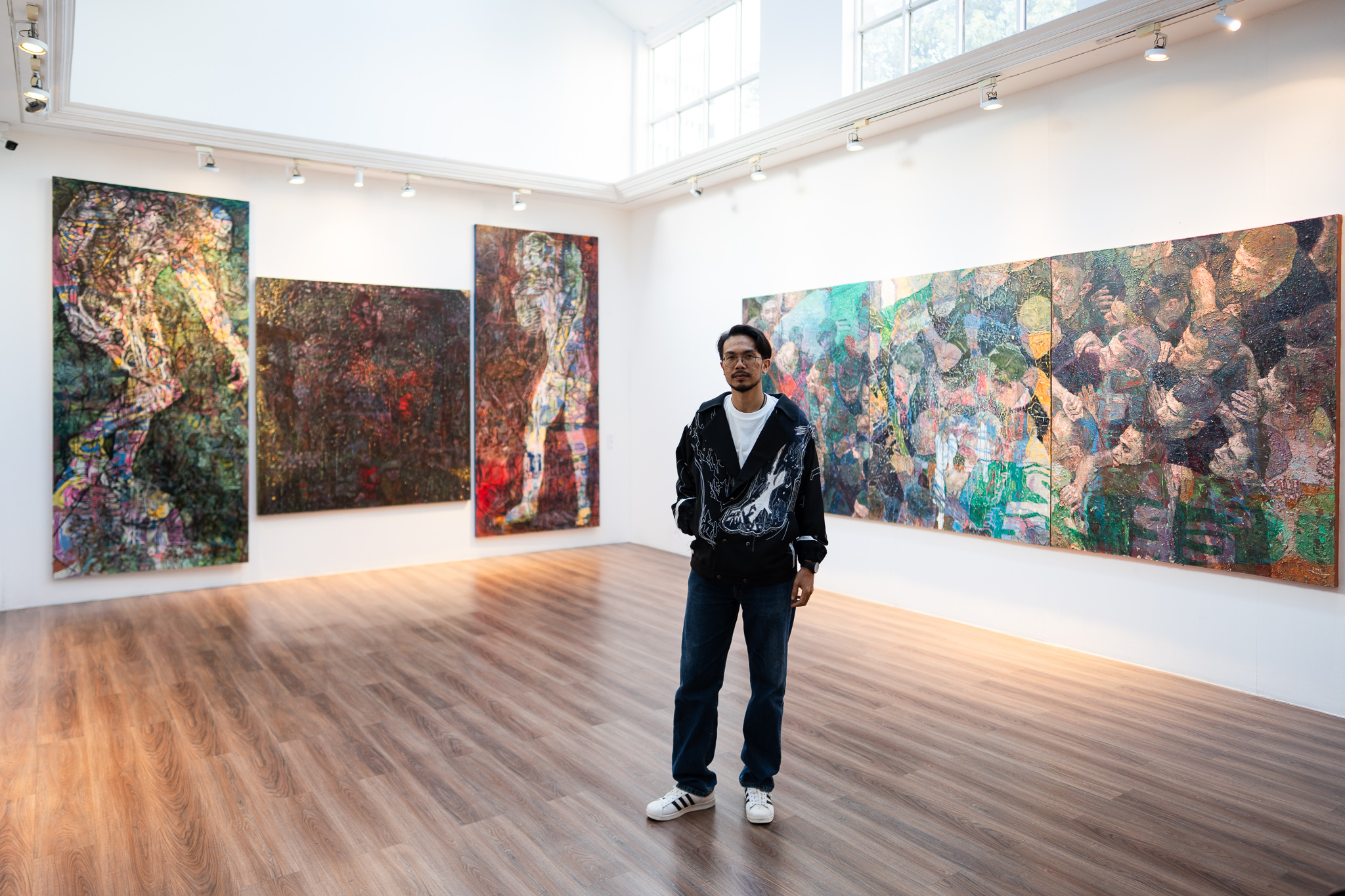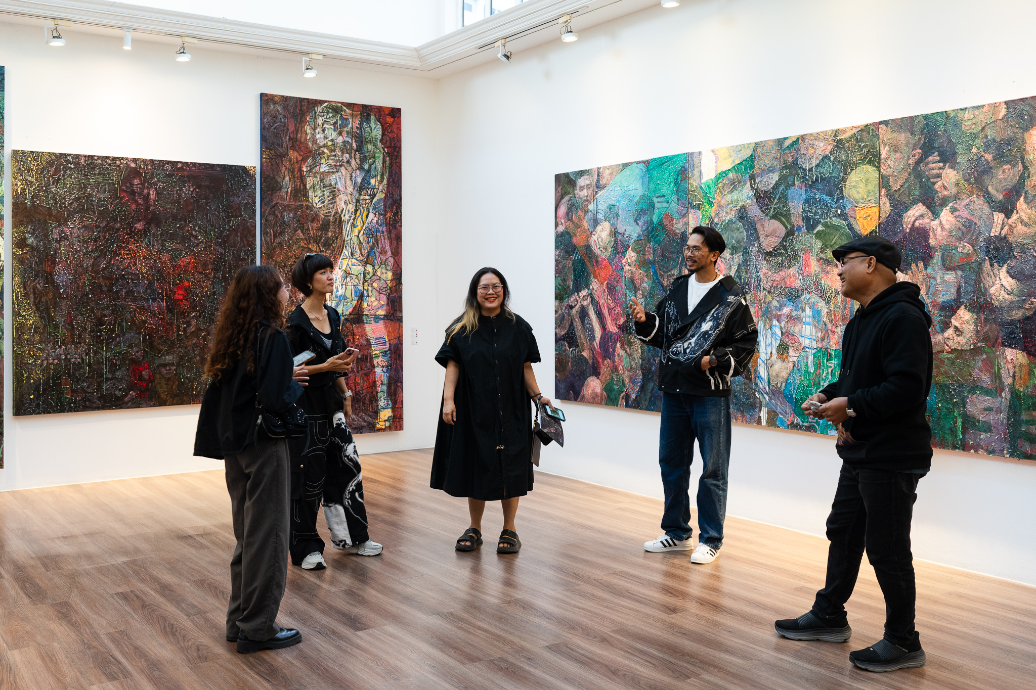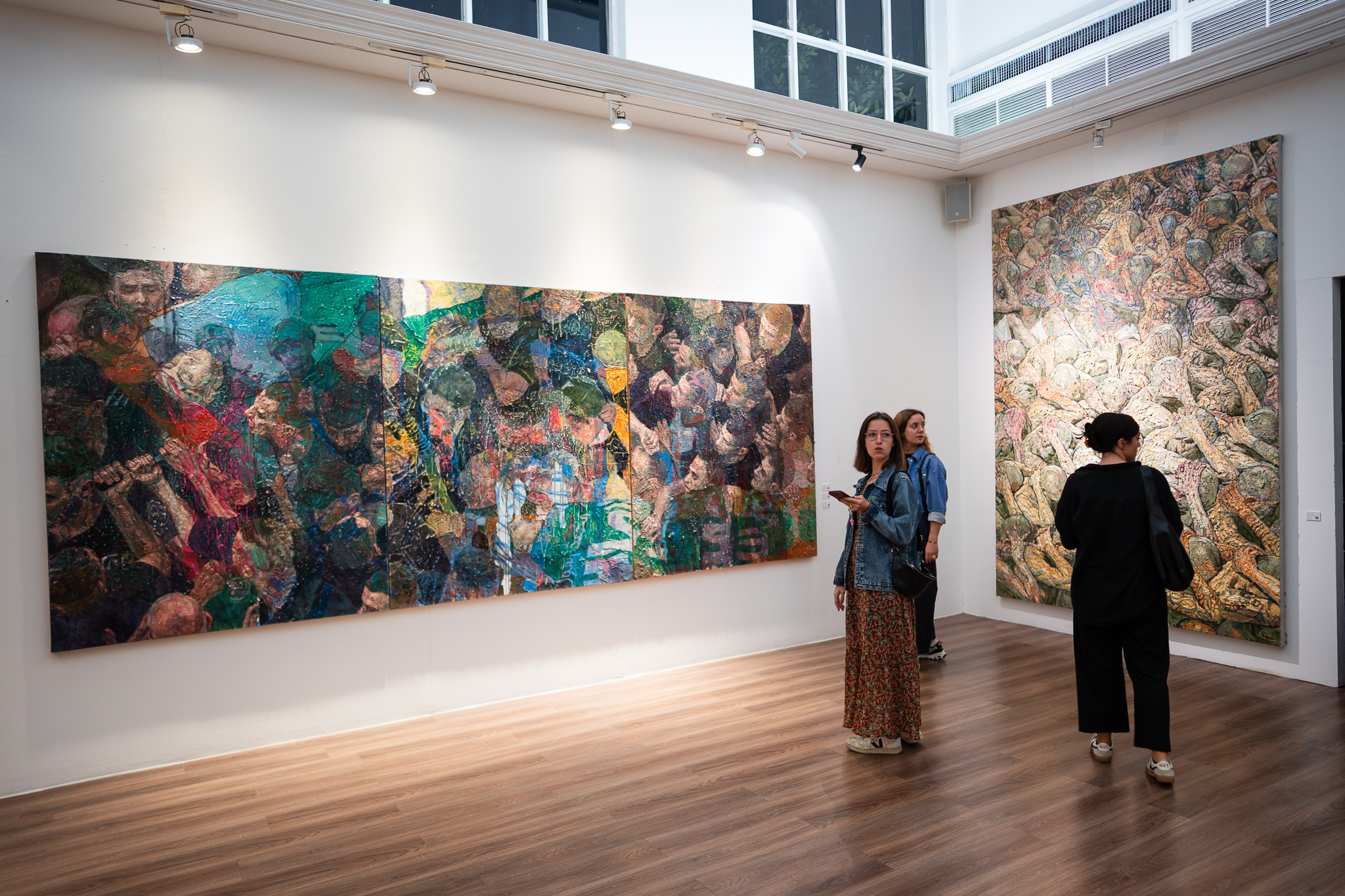 The solo exhibition "Chaos Poet Knight" by Arnont Lertpullpol, presents the hypothesis that chaos in society is a "state" caused by system imperfections, rather than a "designed structure" intended to maintain controllers' power. Arnont reinterprets symbols from Auguste Rodin's paintings The Gates of Hell and The Poet, which depict contemplation of sin and judgment in the afterlife, in the context of today, where "the gates of hell" represent a violent, war-torn, and corrupted human world. The Poet is not just a seeker of wisdom in this case, but also a "manipulator" who observes the misery of others with cold eyes. By conveying the perspective of "those affected" through a creative process that reveals the imperfections of both painting and morality, drawing from contemporary photographs and videos, and employing techniques such as scratching, sanding, thick impasto painting, and layering images, the works create surfaces that reflect the weight and density of social structures. Partially deleting and blurring images calls into doubt the truth, which is picked and altered by power. By revealing some layers of paint while concealing others, each piece contains a trace of concealment and revelation that coexists continuously. The pieces also incorporate pictures that imagine and forecast the grave implications of such buildings persisting.