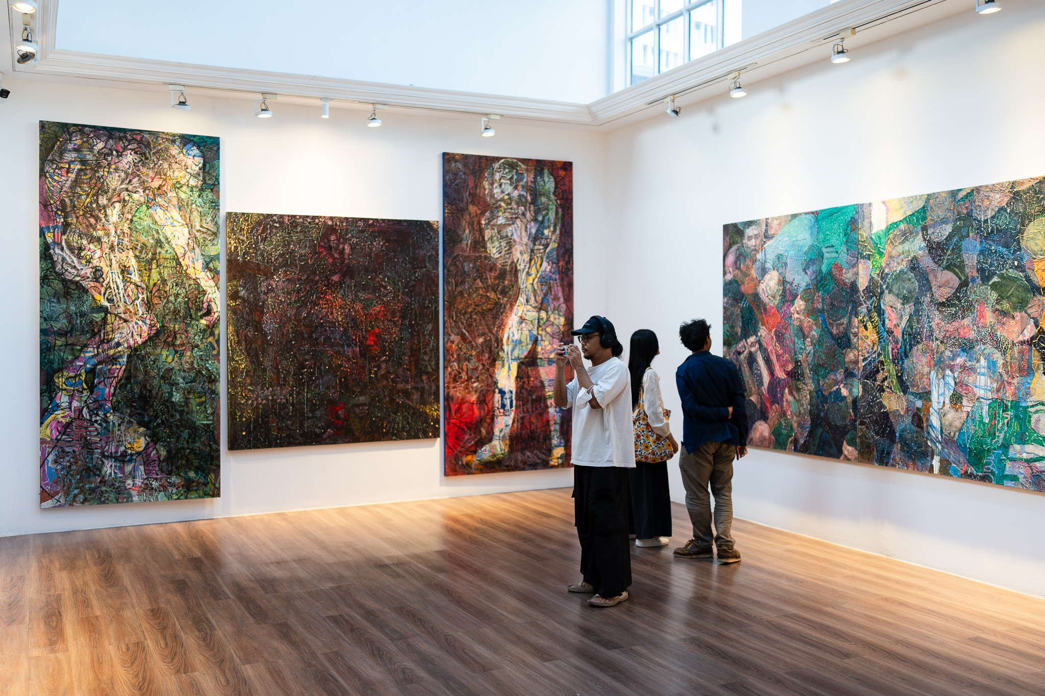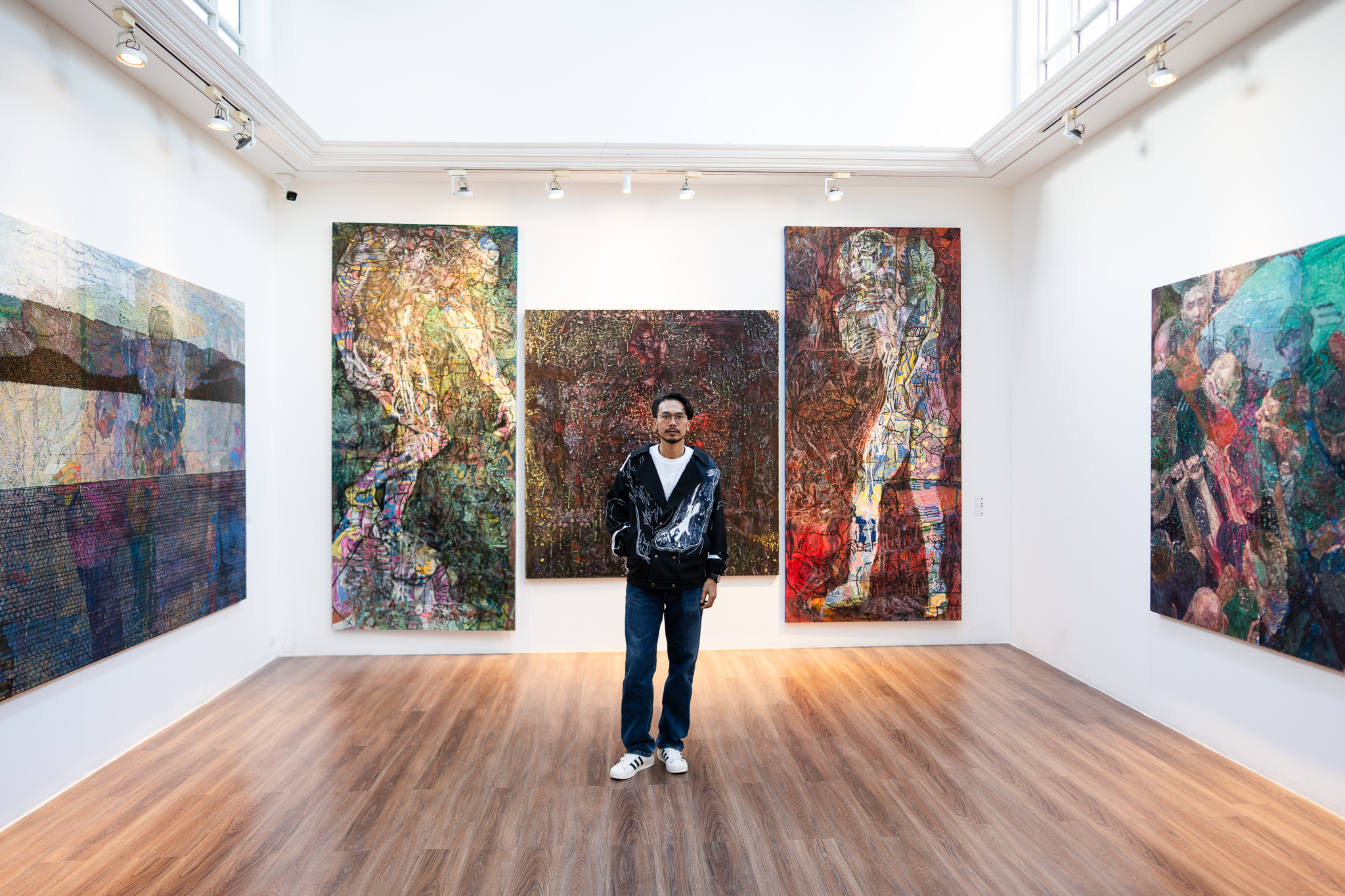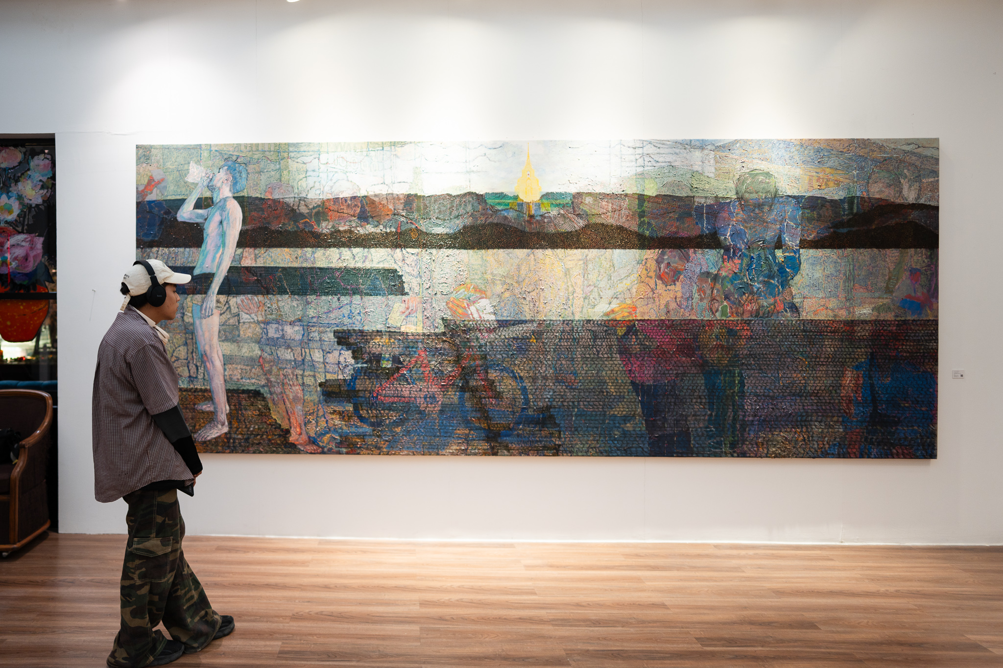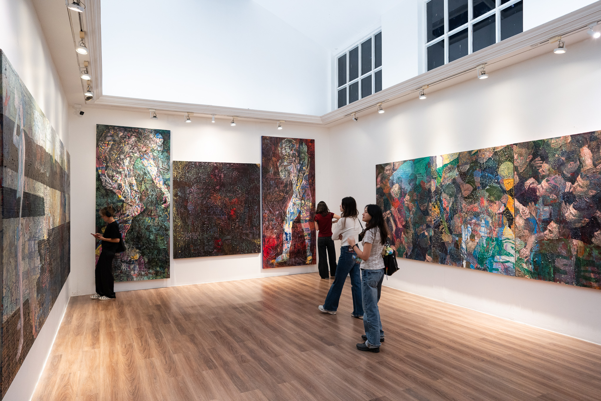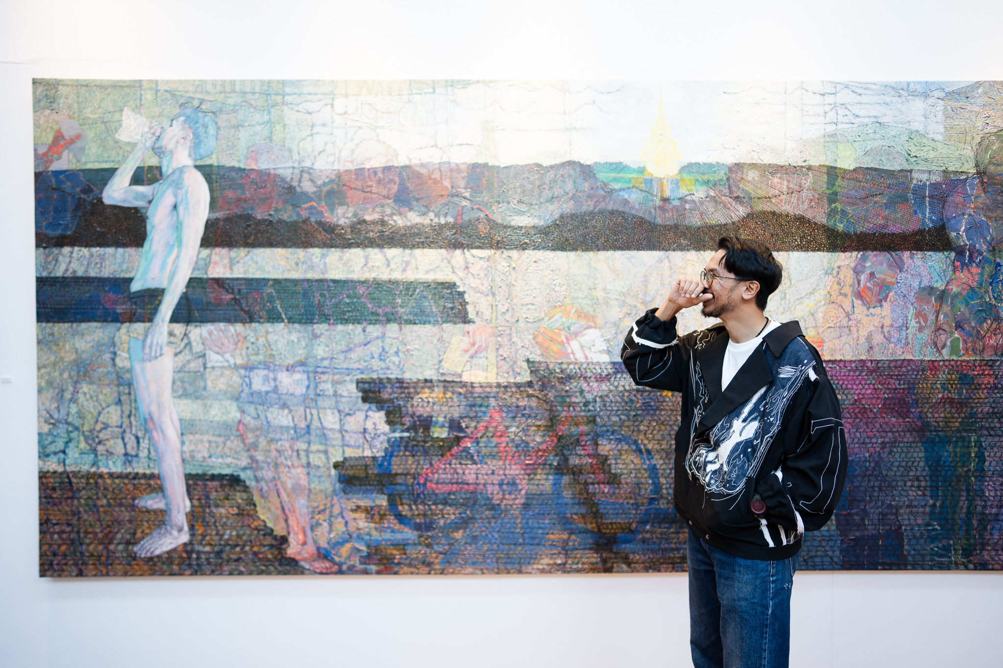 The solo exhibition "Chaos Poet Knight" by Arnont Lertpullpol, presents the hypothesis that chaos in society is a "state" caused by system imperfections, rather than a "designed structure" intended to maintain controllers' power. Arnont reinterprets symbols from Auguste Rodin's paintings The Gates of Hell and The Poet, which depict contemplation of sin and judgment in the afterlife, in the context of today, where "the gates of hell" represent a violent, war-torn, and corrupted human world. The Poet is not just a seeker of wisdom in this case, but also a "manipulator" who observes the misery of others with cold eyes. By conveying the perspective of "those affected" through a creative process that reveals the imperfections of both painting and morality, drawing from contemporary photographs and videos, and employing techniques such as scratching, sanding, thick impasto painting, and layering images, the works create surfaces that reflect the weight and density of social structures. Partially deleting and blurring images calls into doubt the truth, which is picked and altered by power. By revealing some layers of paint while concealing others, each piece contains a trace of concealment and revelation that coexists continuously. The pieces also incorporate pictures that imagine and forecast the grave implications of such buildings persisting.