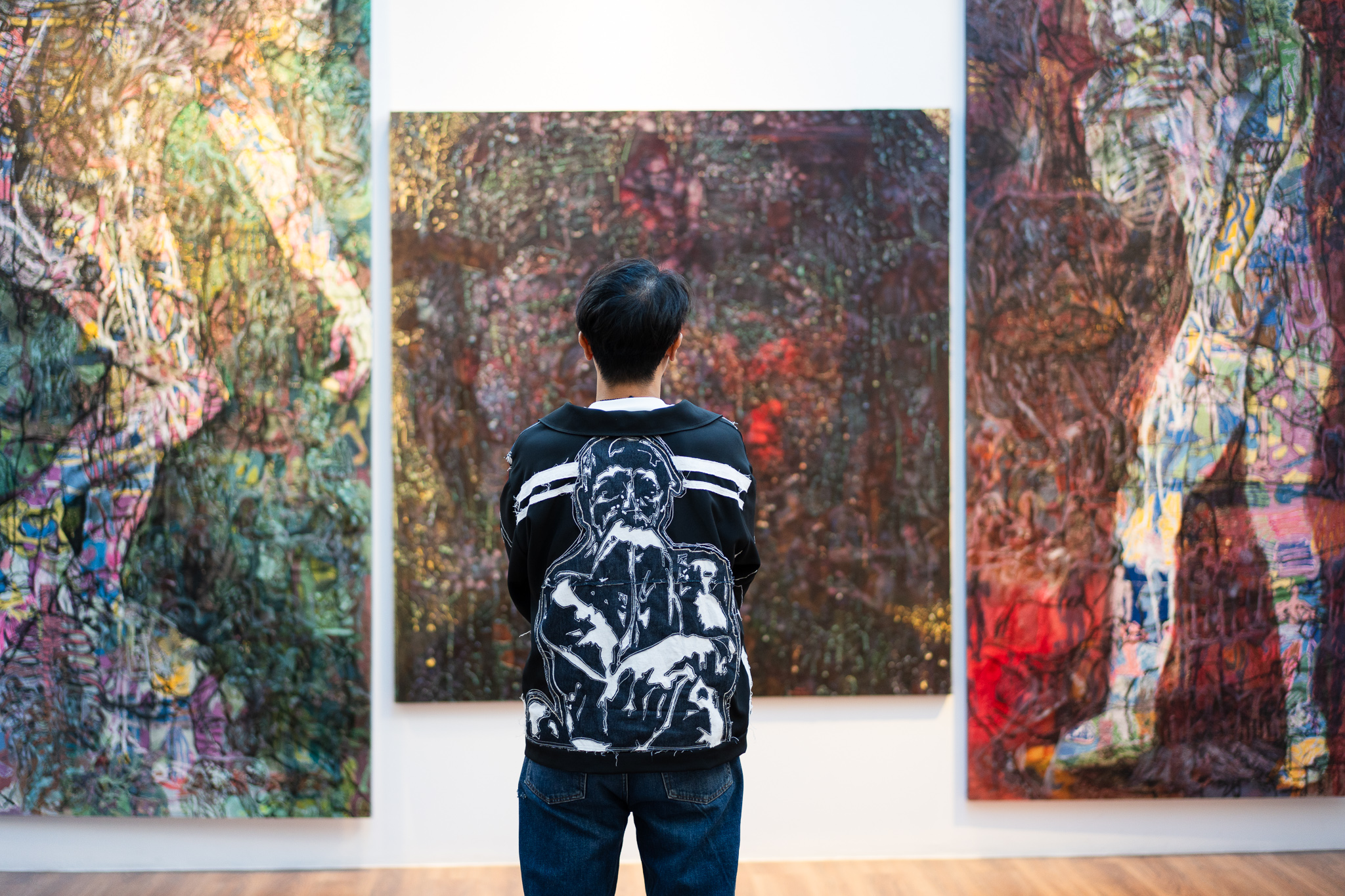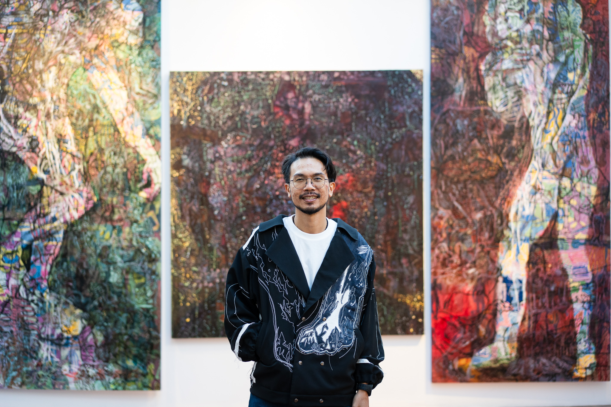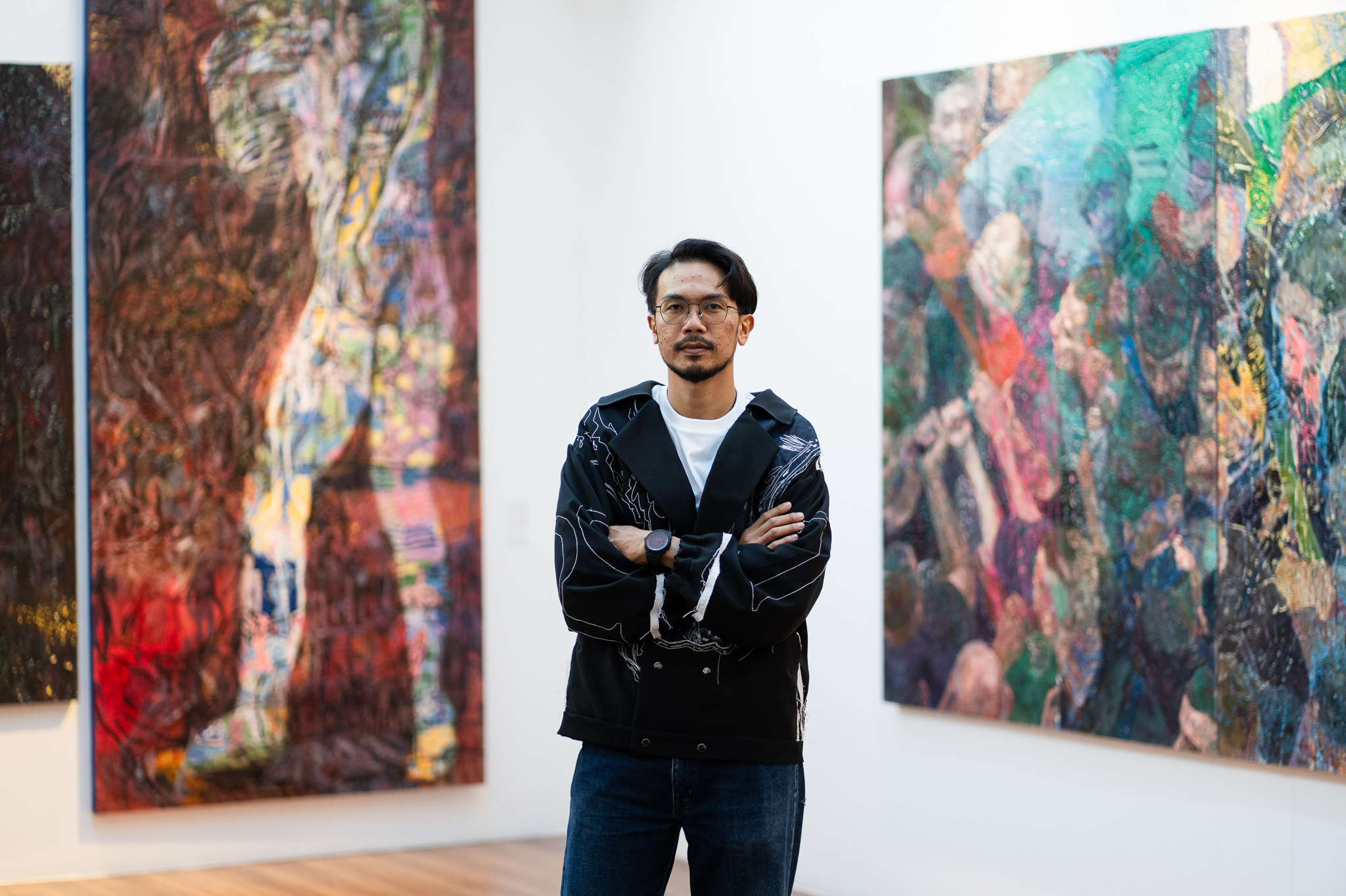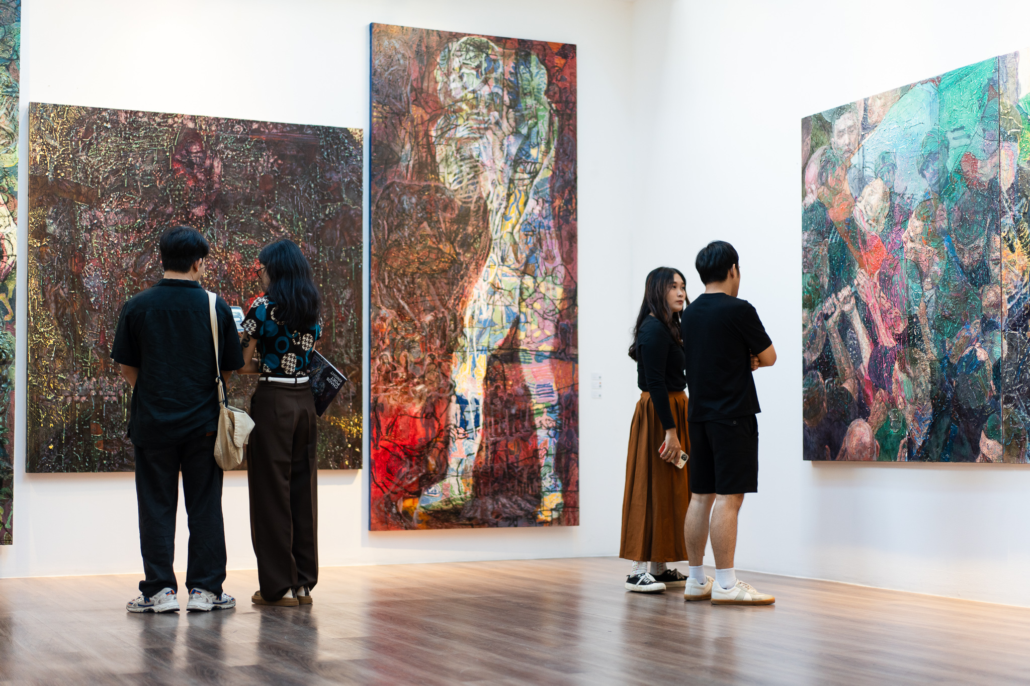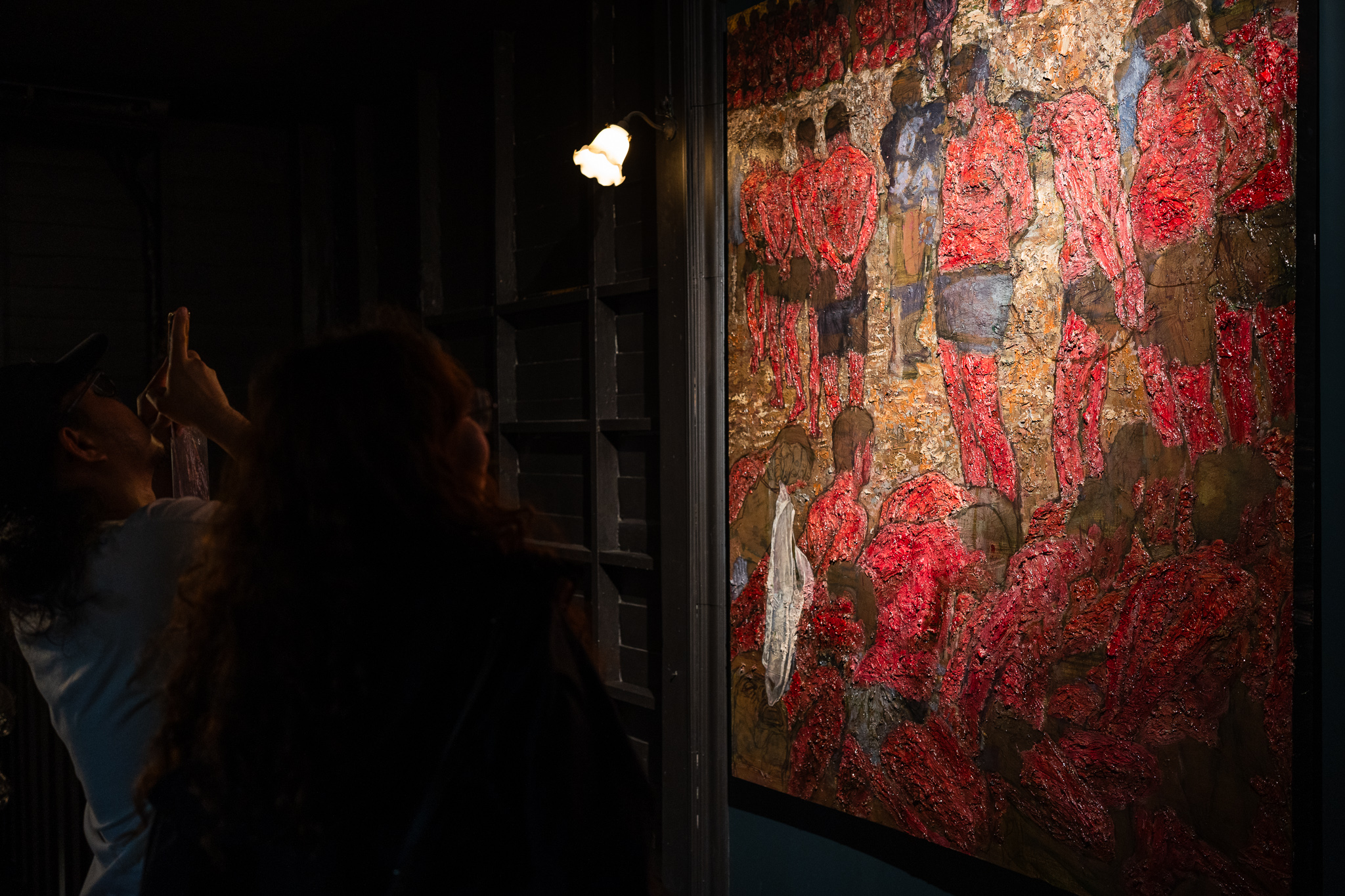 The solo exhibition "Chaos Poet Knight" by Arnont Lertpullpol, presents the hypothesis that chaos in society is a "state" caused by system imperfections, rather than a "designed structure" intended to maintain controllers' power. Arnont reinterprets symbols from Auguste Rodin's paintings The Gates of Hell and The Poet, which depict contemplation of sin and judgment in the afterlife, in the context of today, where "the gates of hell" represent a violent, war-torn, and corrupted human world. The Poet is not just a seeker of wisdom in this case, but also a "manipulator" who observes the misery of others with cold eyes. By conveying the perspective of "those affected" through a creative process that reveals the imperfections of both painting and morality, drawing from contemporary photographs and videos, and employing techniques such as scratching, sanding, thick impasto painting, and layering images, the works create surfaces that reflect the weight and density of social structures. Partially deleting and blurring images calls into doubt the truth, which is picked and altered by power. By revealing some layers of paint while concealing others, each piece contains a trace of concealment and revelation that coexists continuously. The pieces also incorporate pictures that imagine and forecast the grave implications of such buildings persisting.