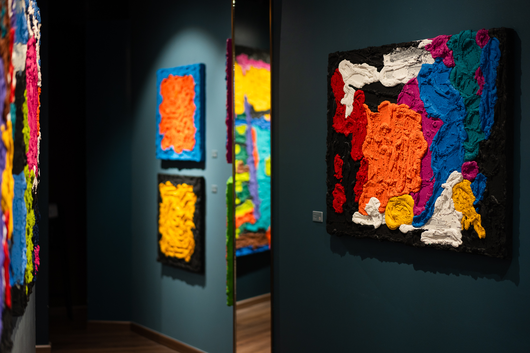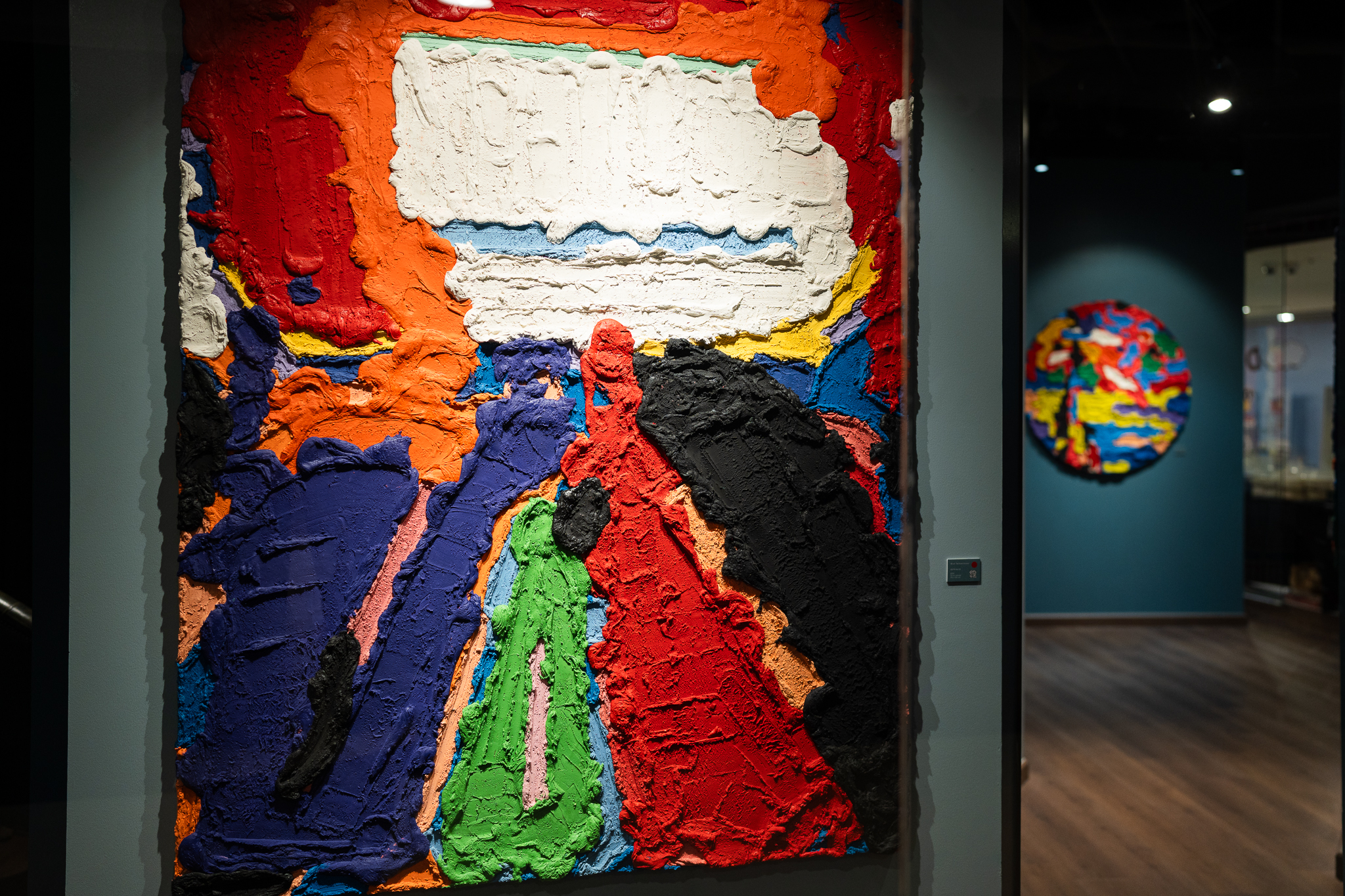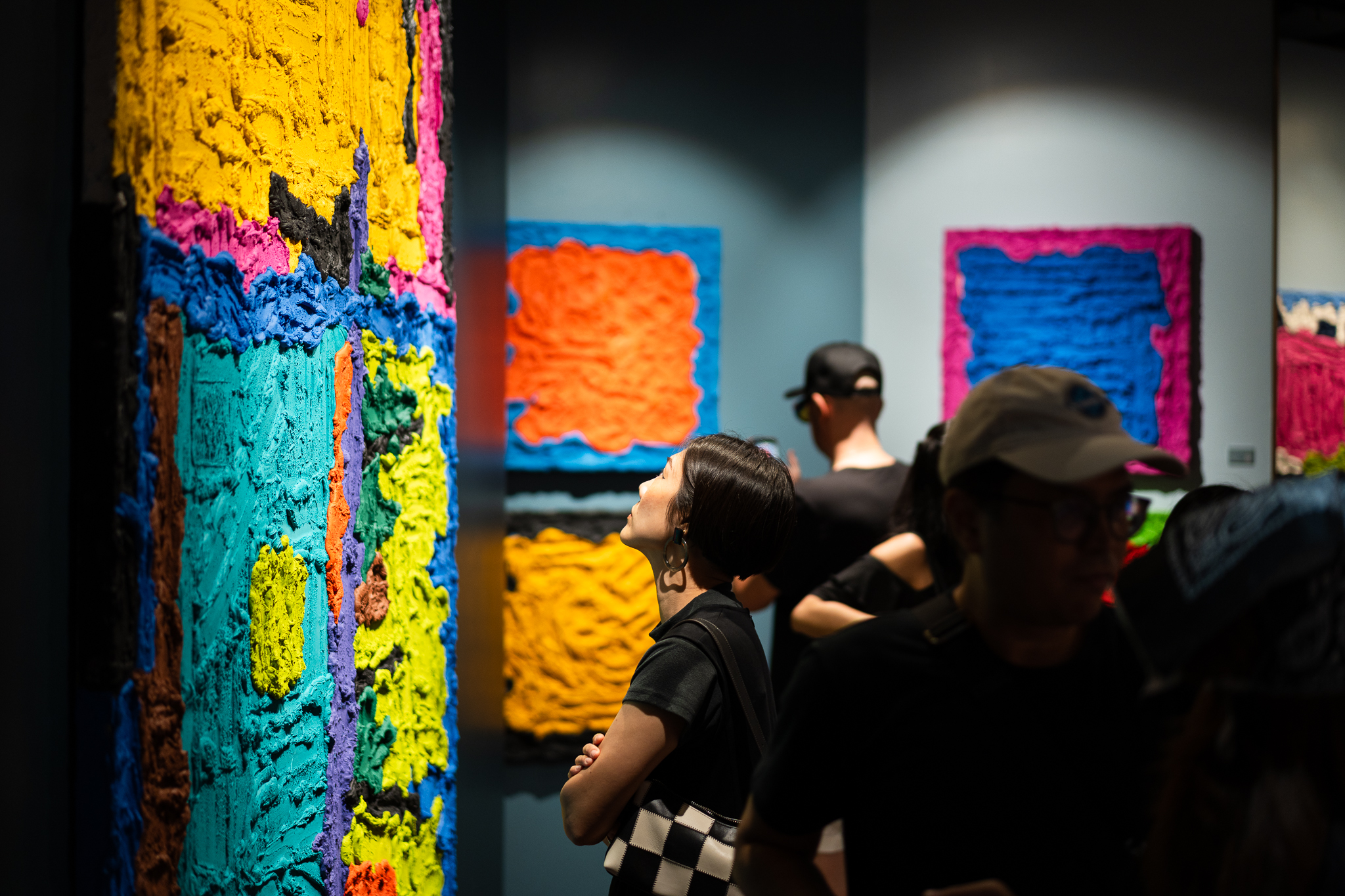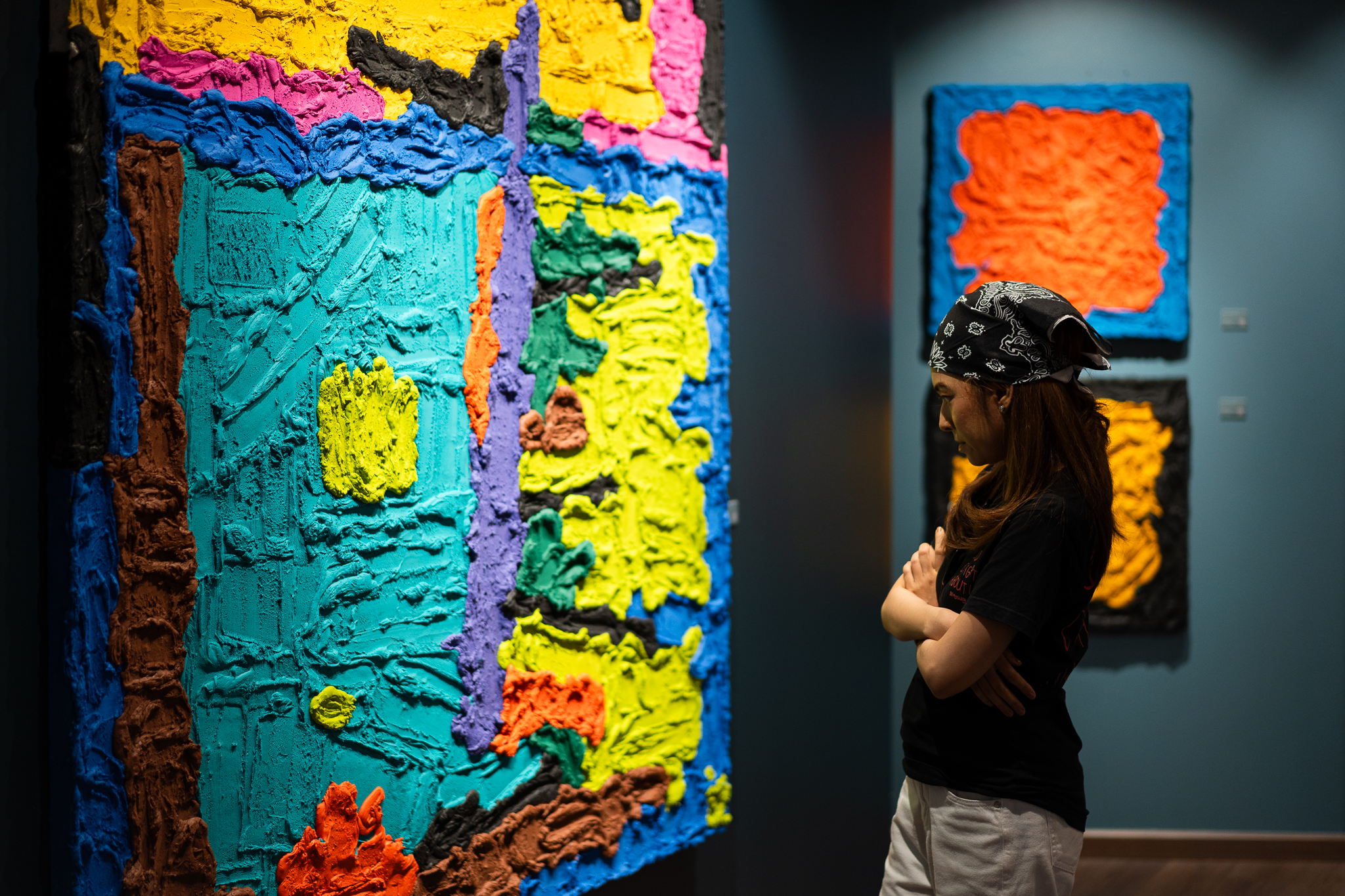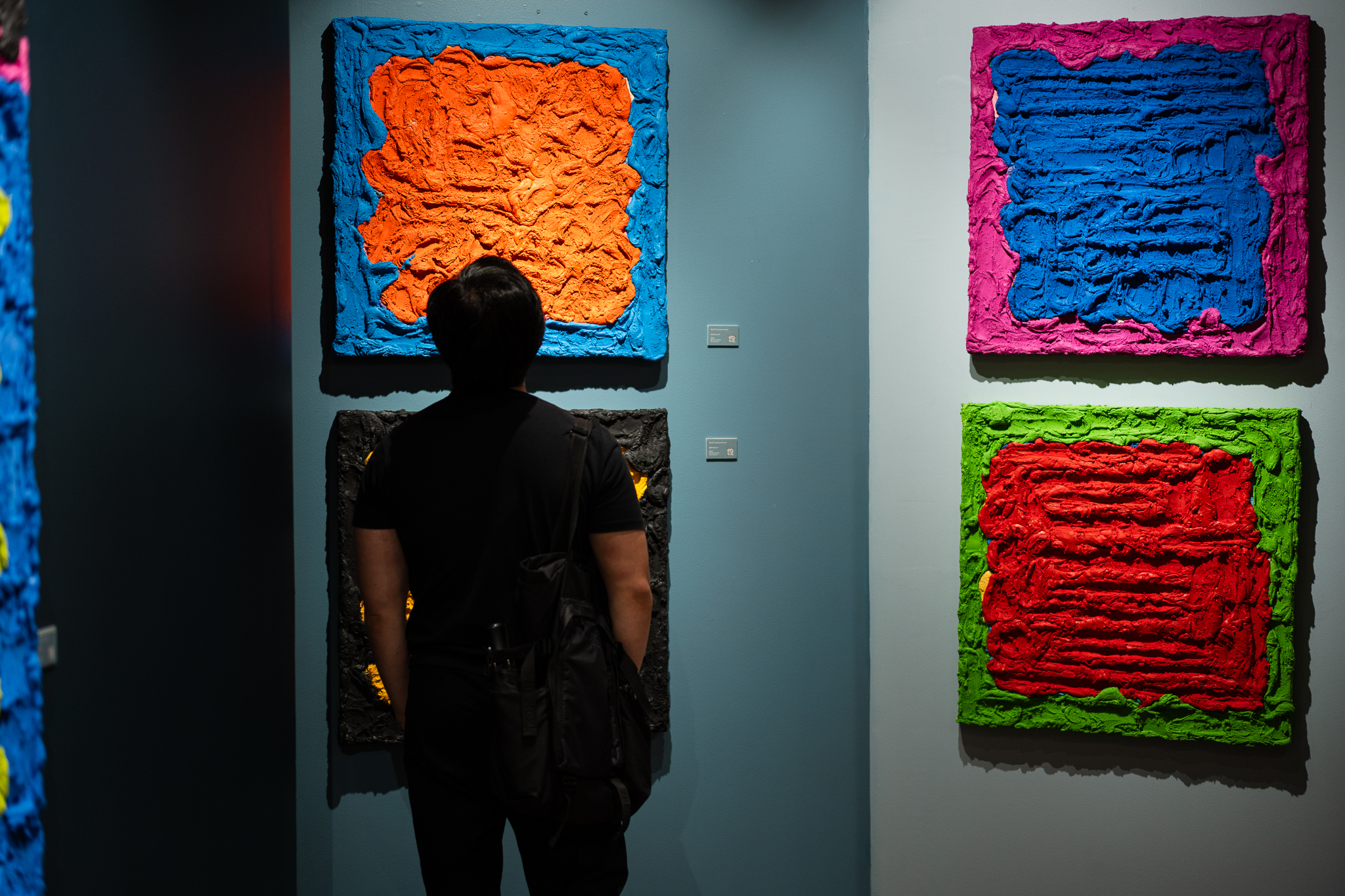 artistic process of abstract art, which not only focuses on expressing emotions but also meticulously plans every line, shape, and color, emphasizing the historical stories of color and connecting them to create multiple layers of color with free forms. This creates an overlapping dimension that reveals the changing meaning of color over time and in different social contexts. He also