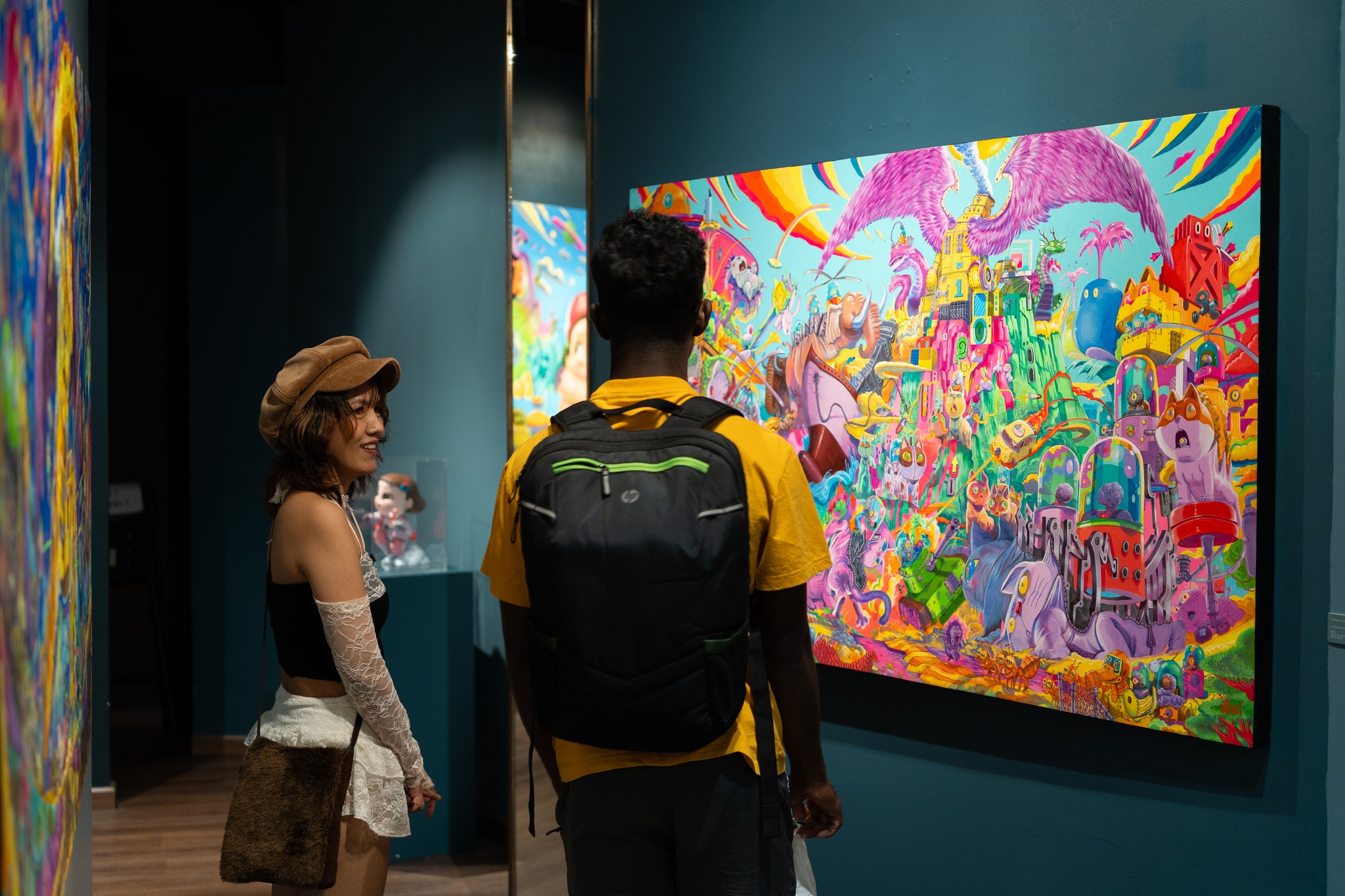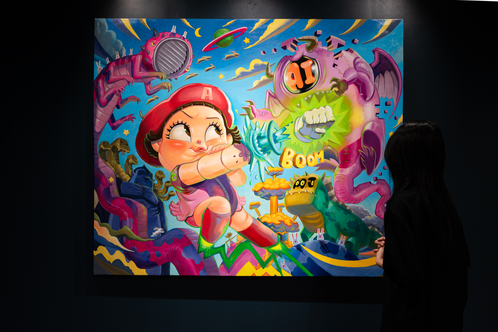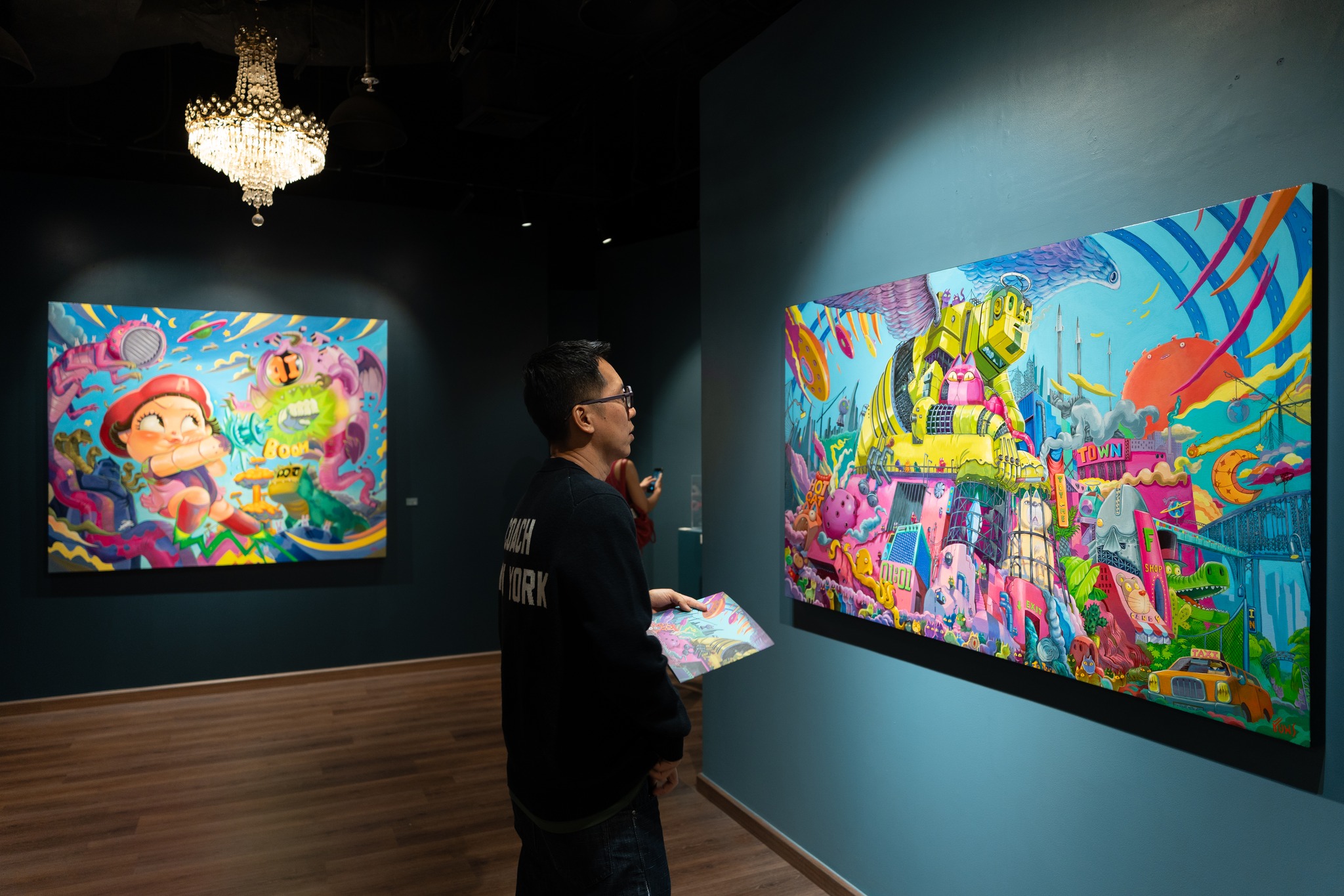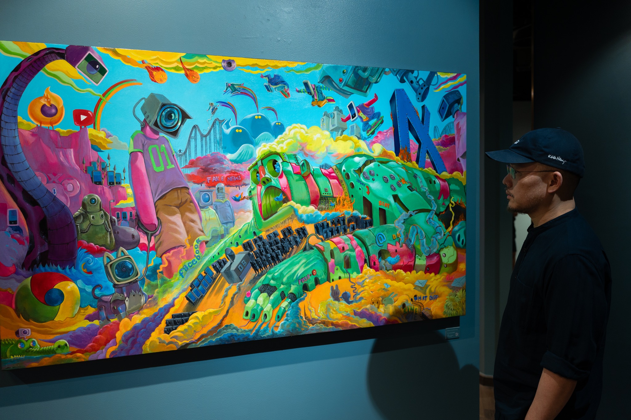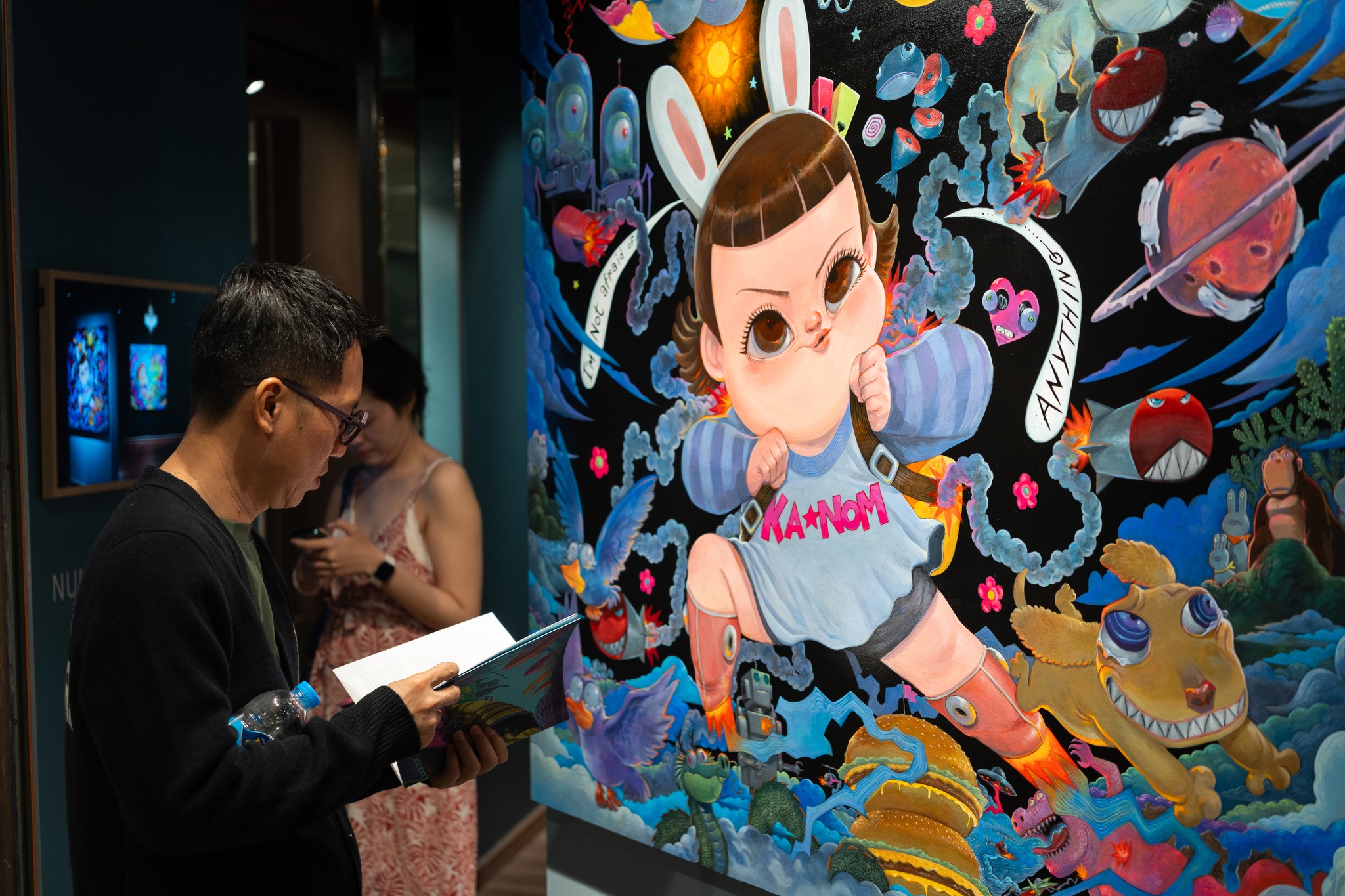 “𝑷𝒓𝒐𝒋𝒆𝒄𝒕 𝑿 𝒕𝒐 𝒕𝒉𝒆 𝑷𝒐𝒘𝒆𝒓 𝒐𝒇 5: 𝑻𝒂𝒏𝒈𝒊𝒃𝒍𝒆” marks the fifth solo exhibition by Chaiporn Panichrutiwong, Thailand’s first-ever recipient of the Designer of the Year 2023 award in the Digital Design category. Renowned in the world of computer digital animation and NFTs, Chaiporn presents a new series of artworks on canvas transforming his own purely digital NFT creations, which cannot be physically touched in their original form, into tangible paintings. Through his masterful and distinctive brushwork, these once-intangible digital visions are brought into the physical world. Some pieces in this series also continue to feature the artist’s beloved and charming girl character, “Nong Kanom,” as in his previous works.