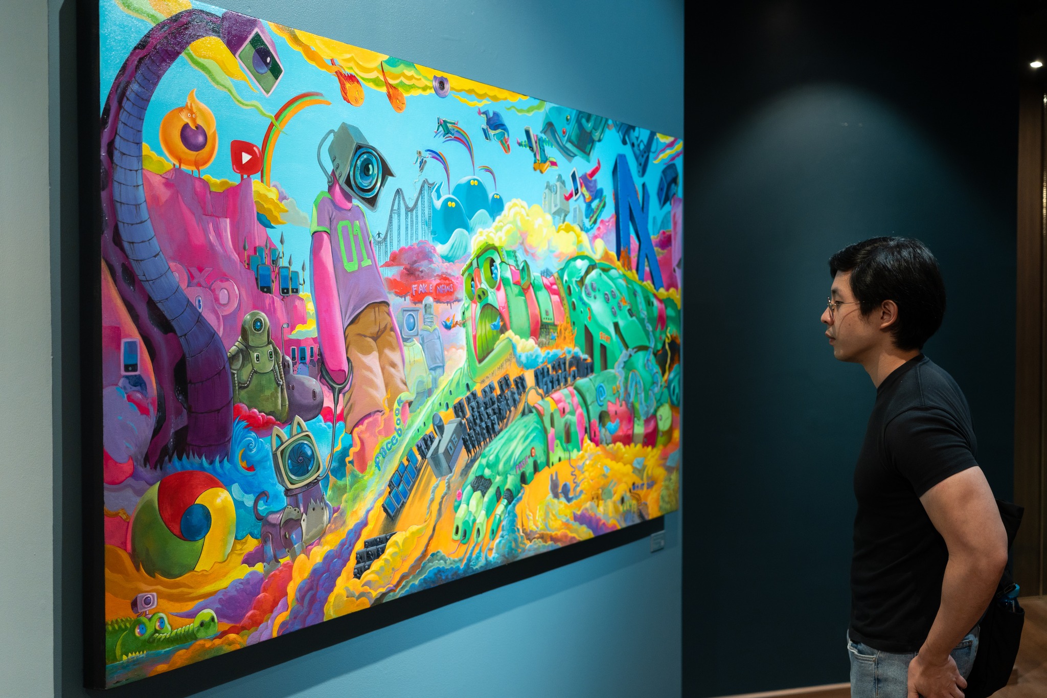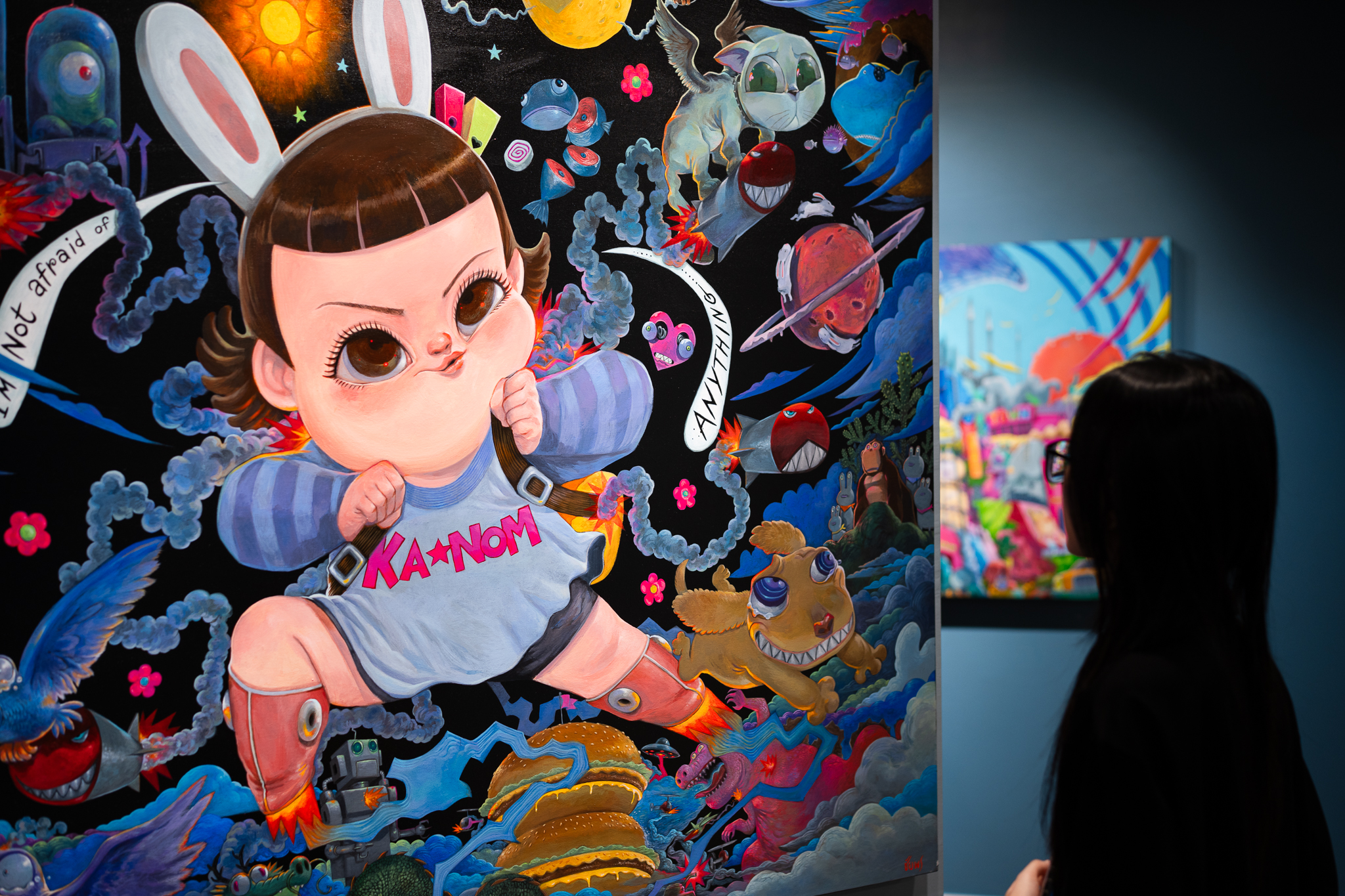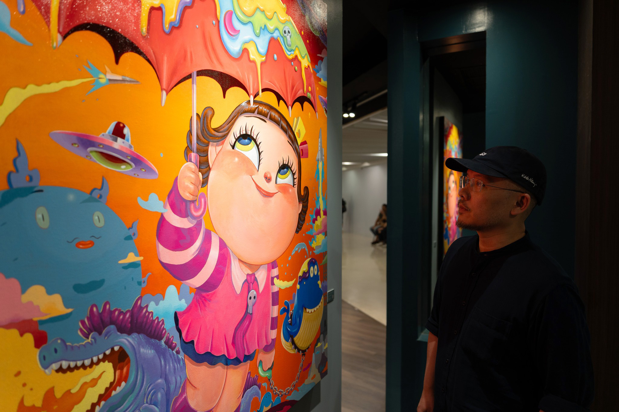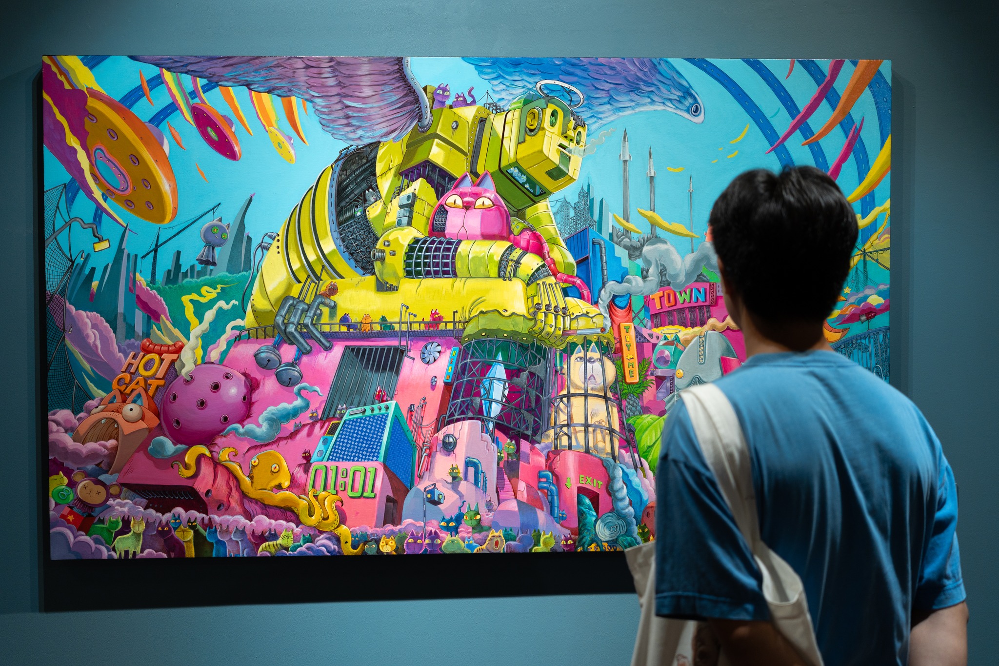 “𝑷𝒓𝒐𝒋𝒆𝒄𝒕 𝑿 𝒕𝒐 𝒕𝒉𝒆 𝑷𝒐𝒘𝒆𝒓 𝒐𝒇 5: 𝑻𝒂𝒏𝒈𝒊𝒃𝒍𝒆” marks the fifth solo exhibition by Chaiporn Panichrutiwong, Thailand’s first-ever recipient of the Designer of the Year 2023 award in the Digital Design category. Renowned in the world of computer digital animation and NFTs, Chaiporn presents a new series of artworks on canvas transforming his own purely digital NFT creations, which cannot be physically touched in their original form, into tangible paintings. Through his masterful and distinctive brushwork, these once-intangible digital visions are brought into the physical world. Some pieces in this series also continue to feature the artist’s beloved and charming girl character, “Nong Kanom,” as in his previous works.