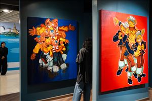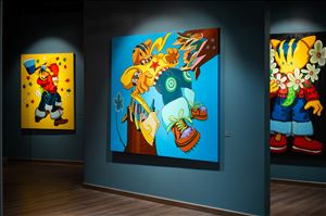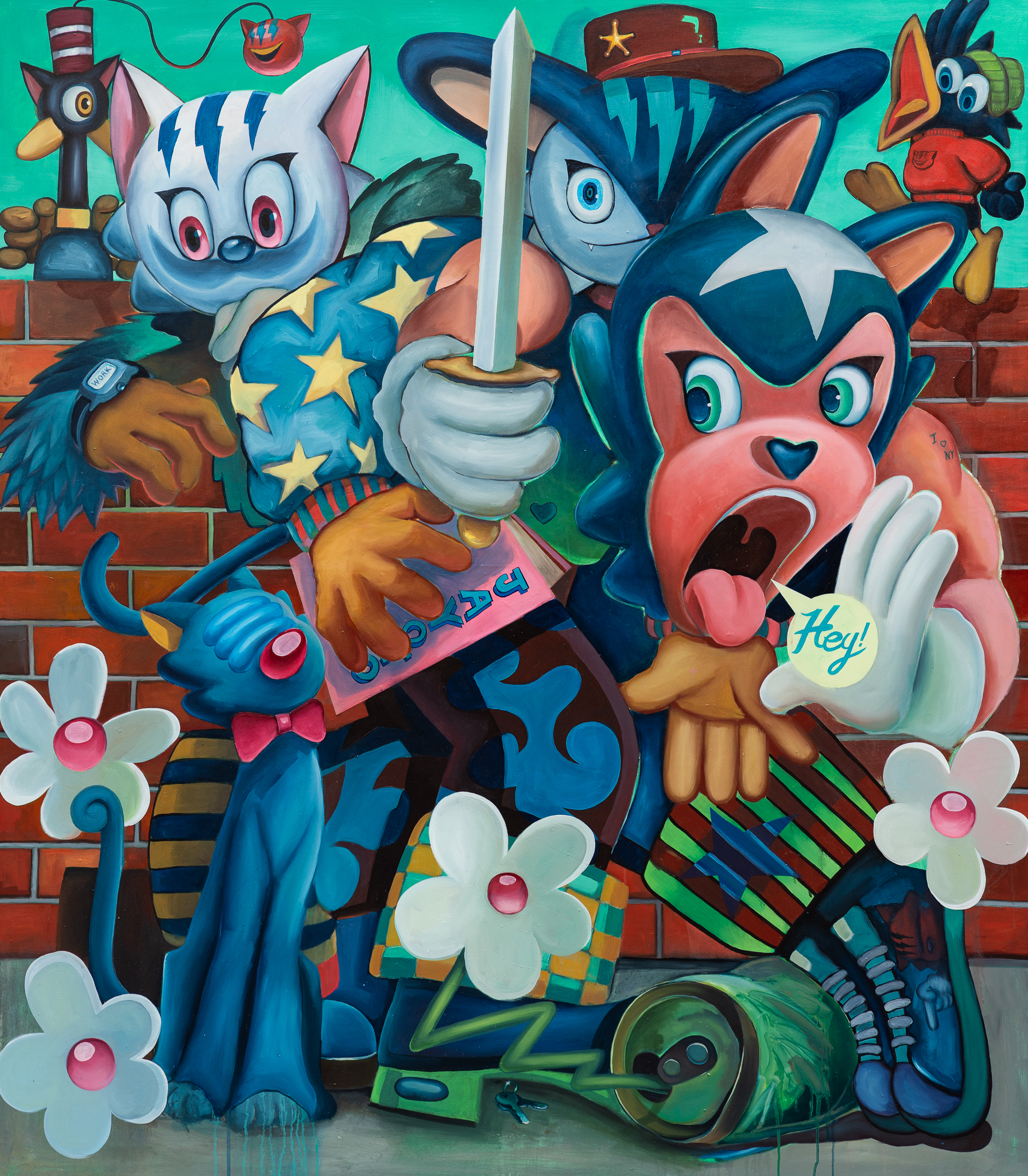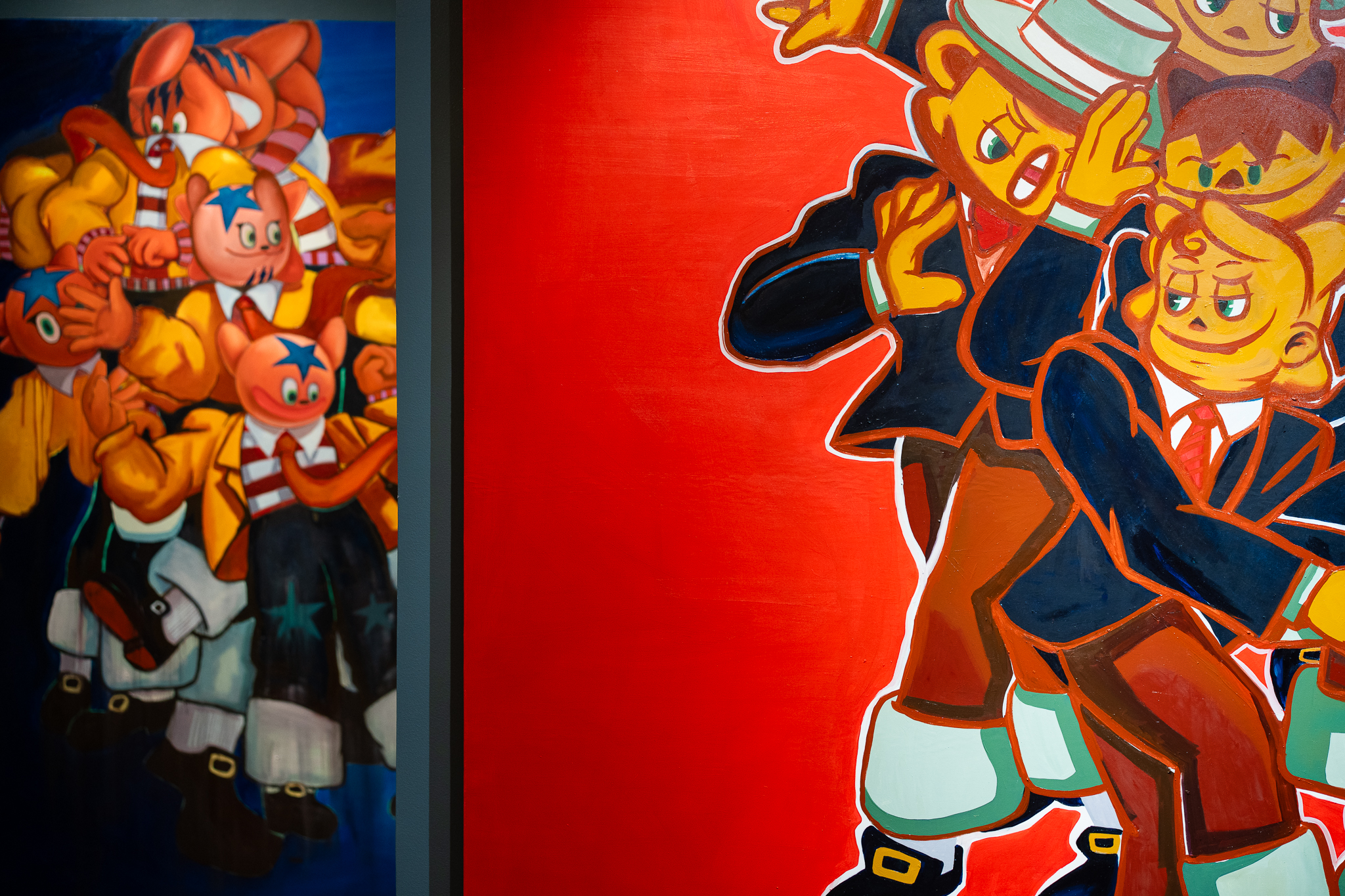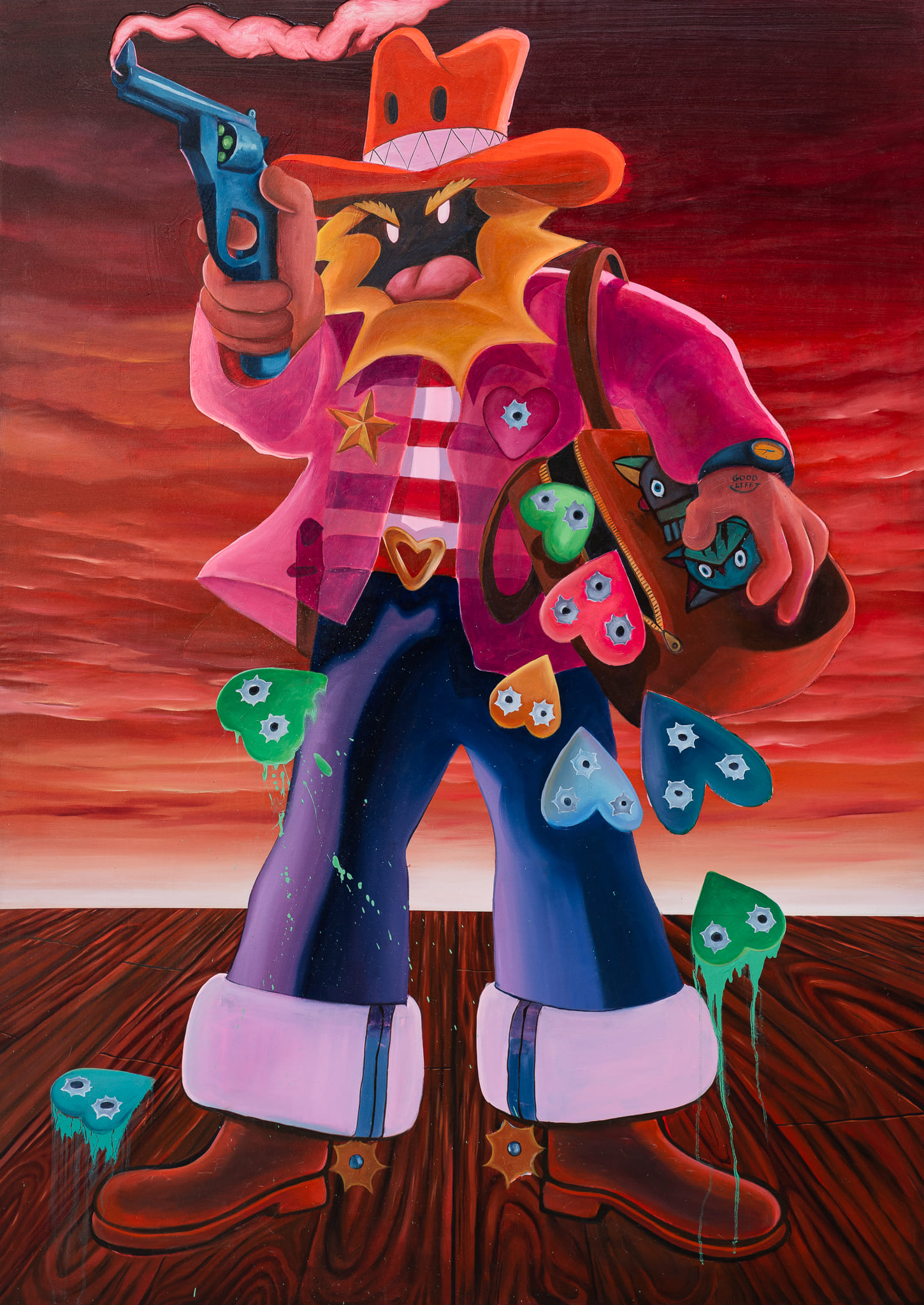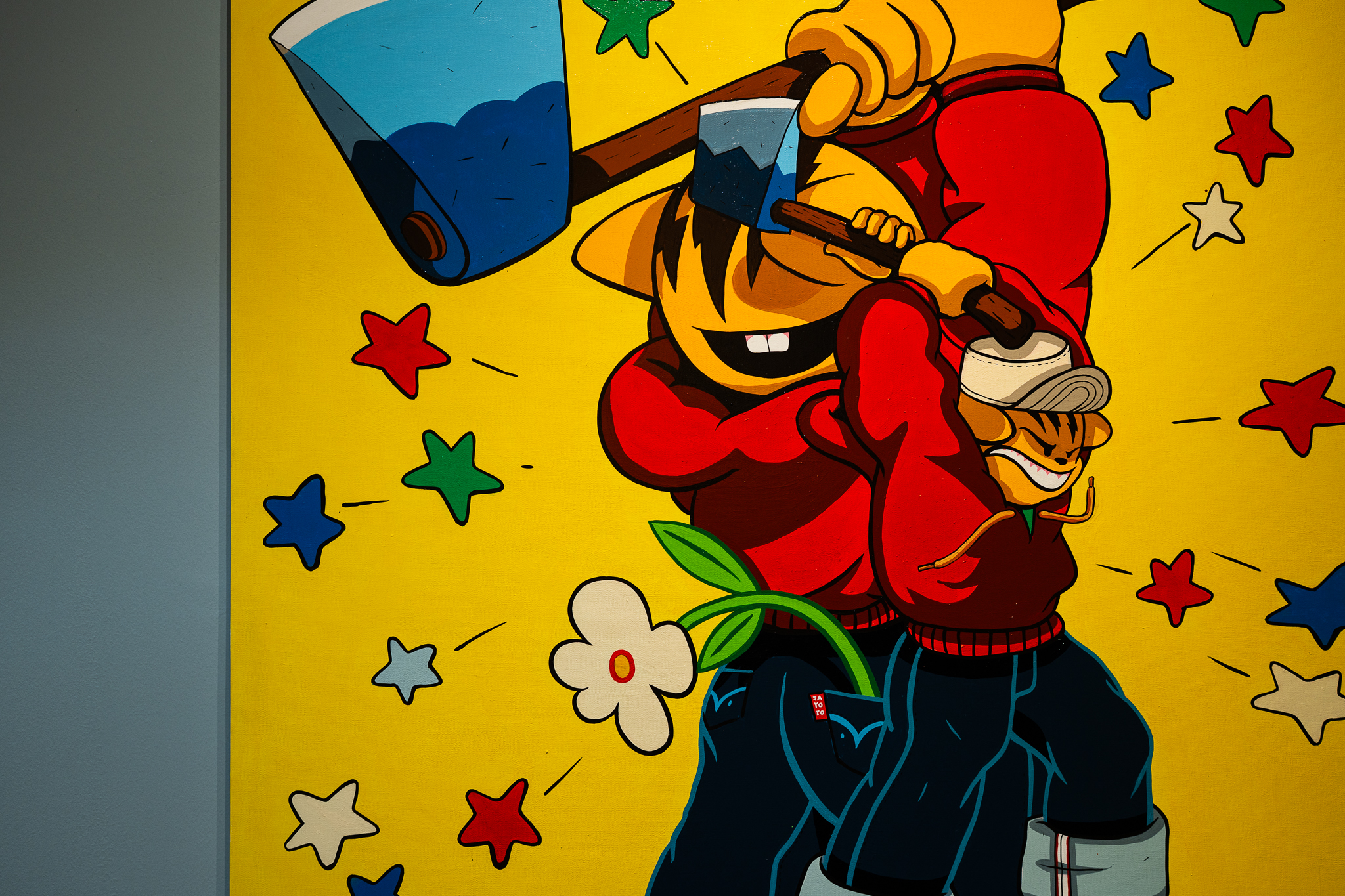 Inspired by comics, popular cinema, animation, and the solemn corridors of museums, JAYOTO transforms these fragments into a language at once incisive and vivid. His hybrid characters are not simply figures; they are vessels of paradox — embodying the tension between absurdity and gravity, between sociability and solitude.